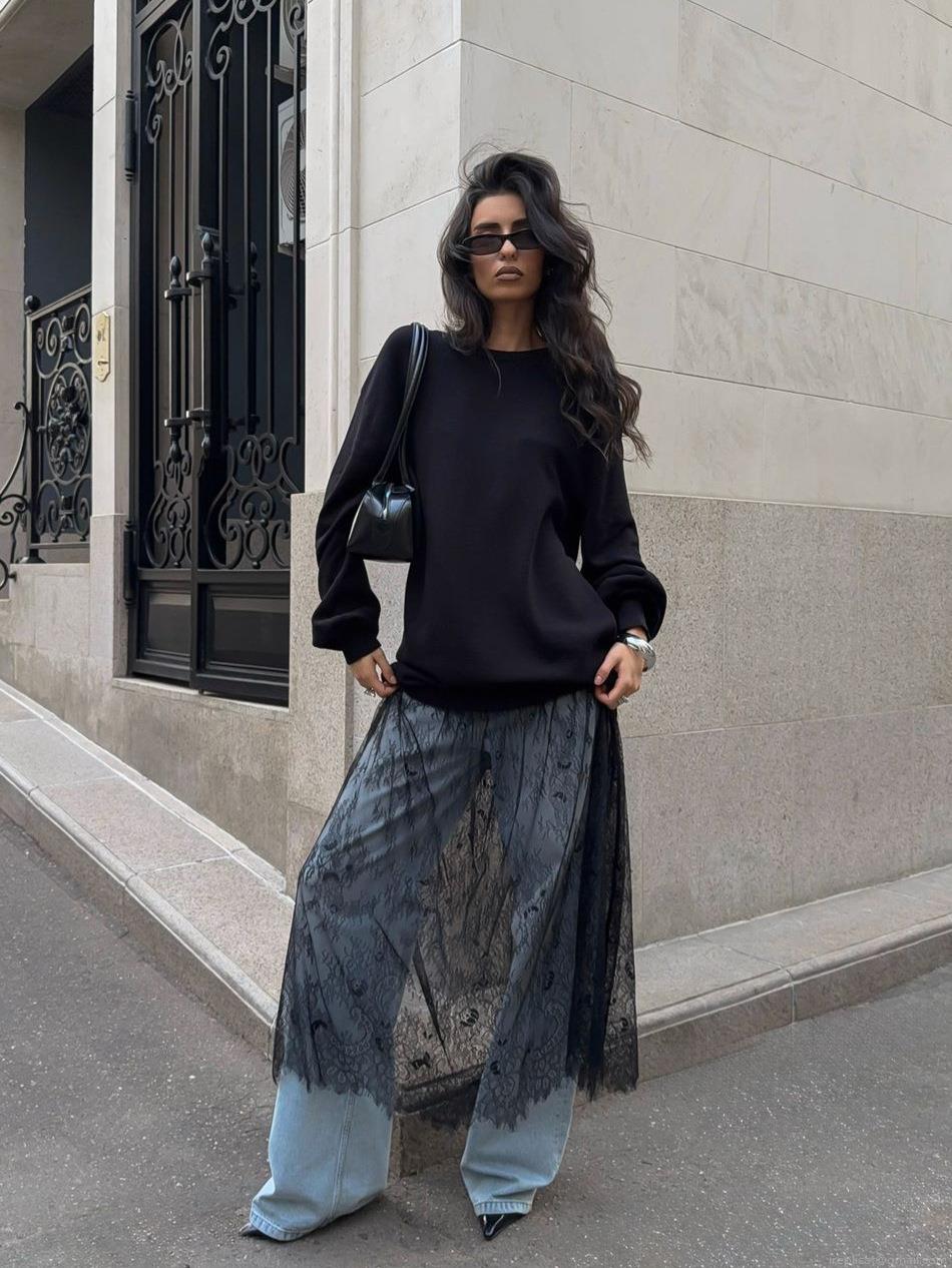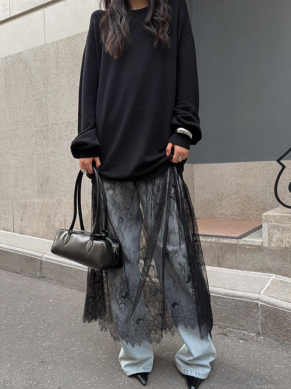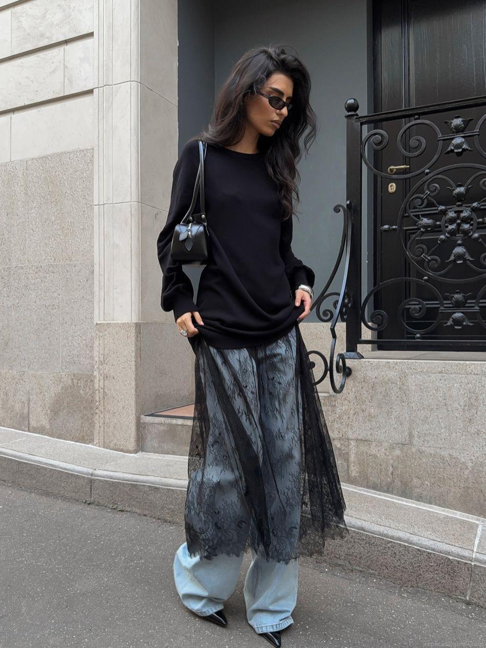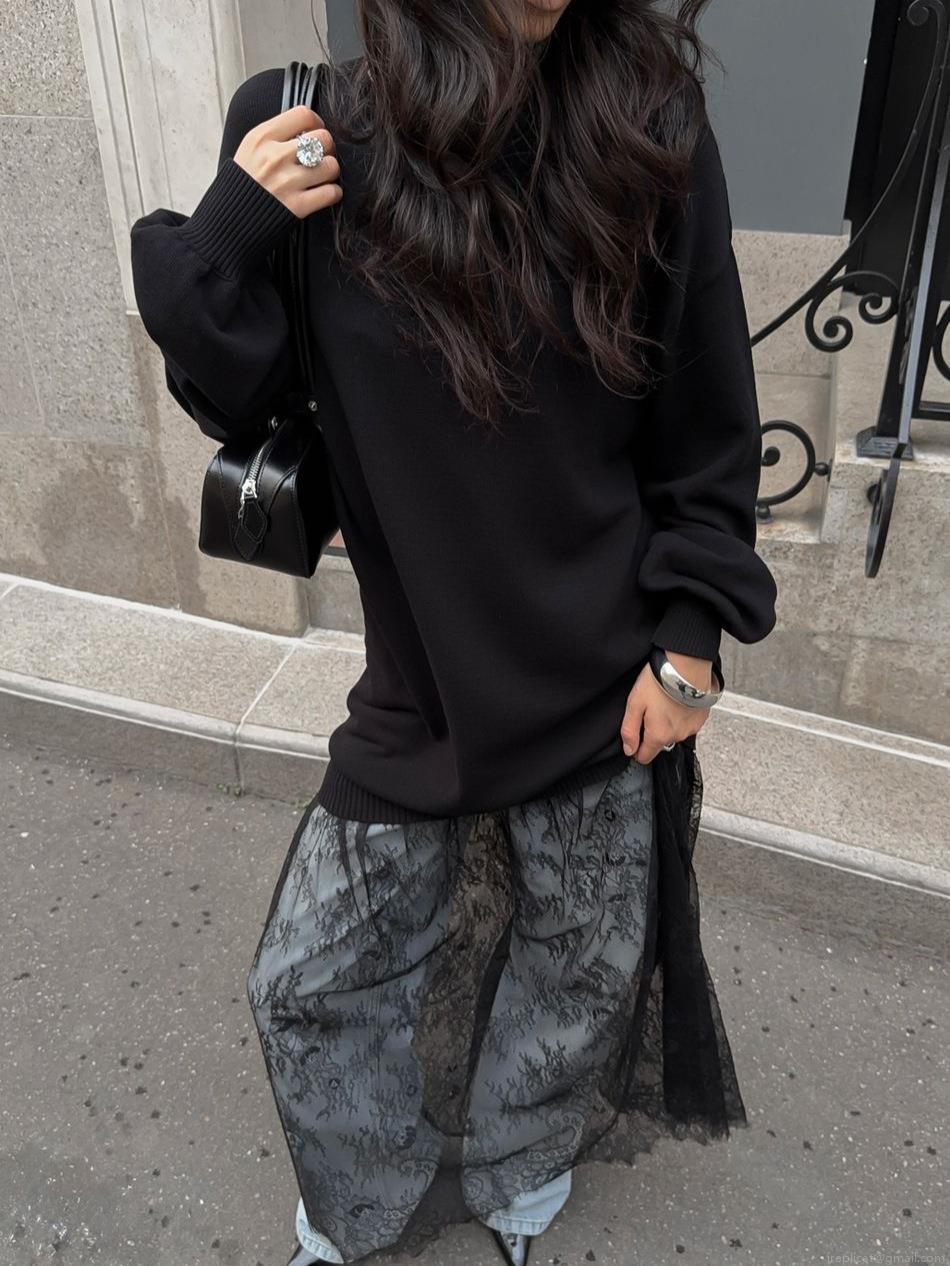 • Niche Design Lace Patchwork Long Sleeve Knit Sweater Women Autumn Winter Round Neck Pullover Solid Color Loose Knitted Top Elegant Commuter Style Base Layer
