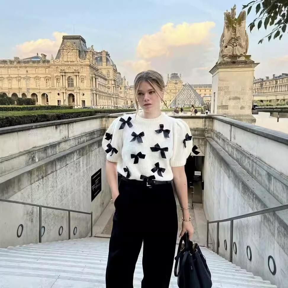 • Sweet Bowknot Decorated Women's Short Sleeve Knit Sweater Polyester Soft Round Neck Puff Sleeve Pullover Elegant Casual White Knitwear Top For Ladies