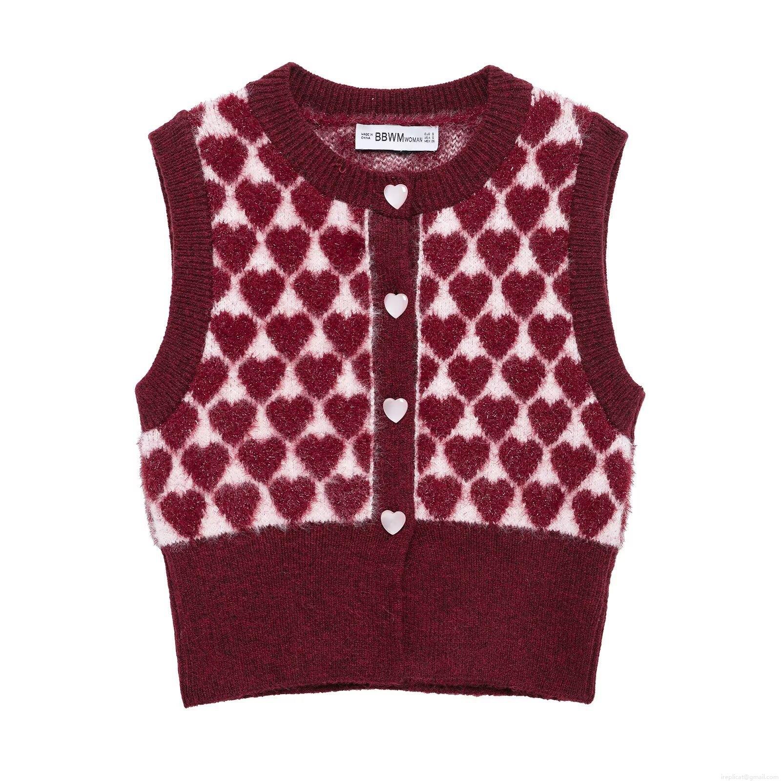 • Vintage Heart Pattern Knit Vest Cardigan For Women Sweet Sleeveless Button Down Sweater Top With Heart Buttons Valentine's Day Gift Apparel
