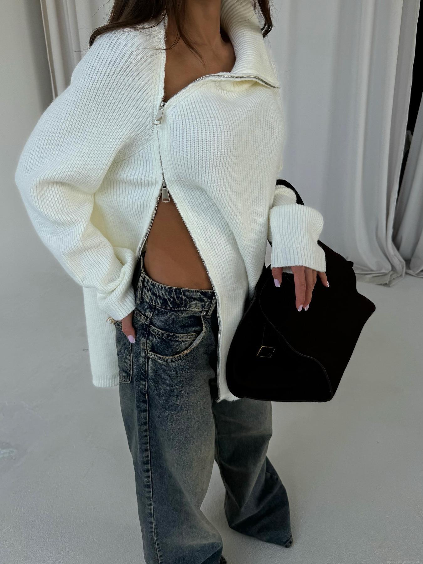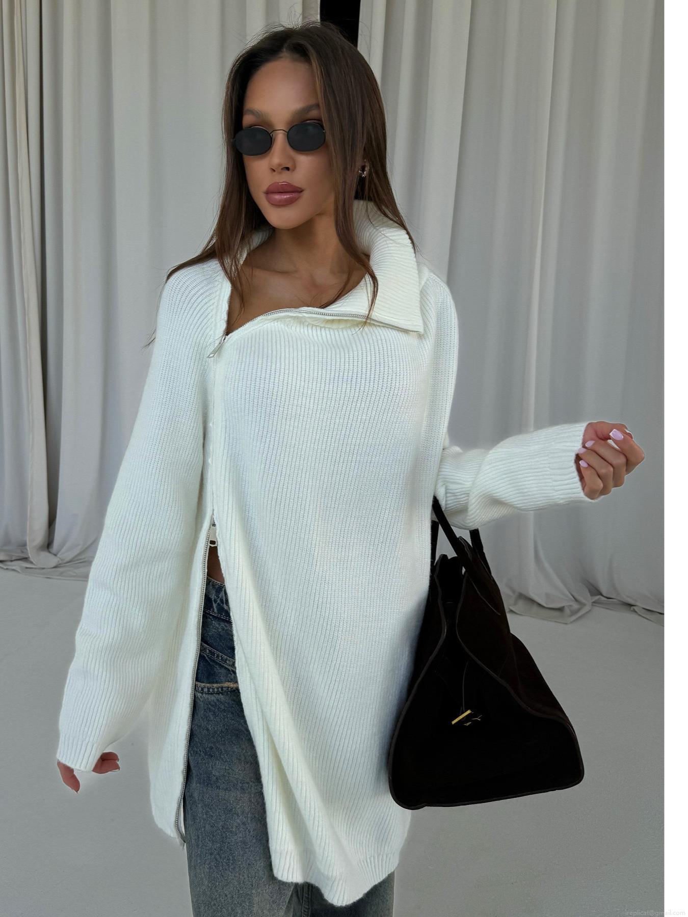 • Women Asymmetric Diagonal Zipper High Neck Knit Sweater Minimalist Cotton Blend Ribbed Pullover Oversized Long Sleeve Side Slit Streetwear Jumper Top
