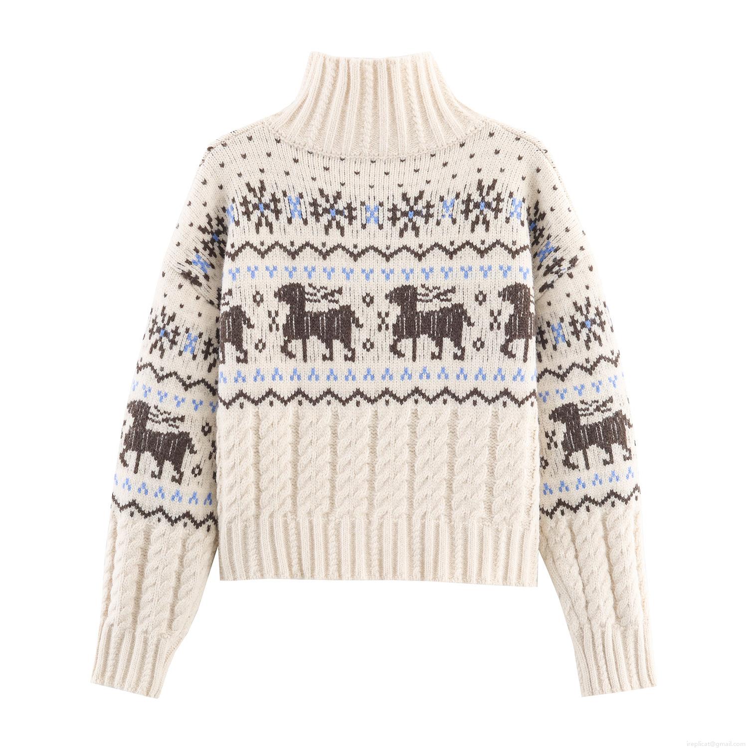 • Women Christmas Reindeer Knit Cardigan Retro High Neck Button Up Long Sleeve Polyester Nordic Fair Isle Winter Warm Sweater Top For Ladies Xmas Holiday