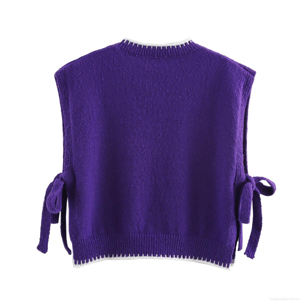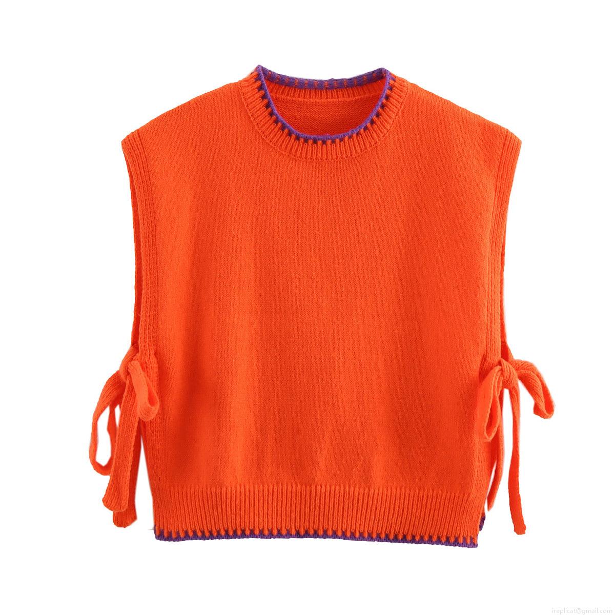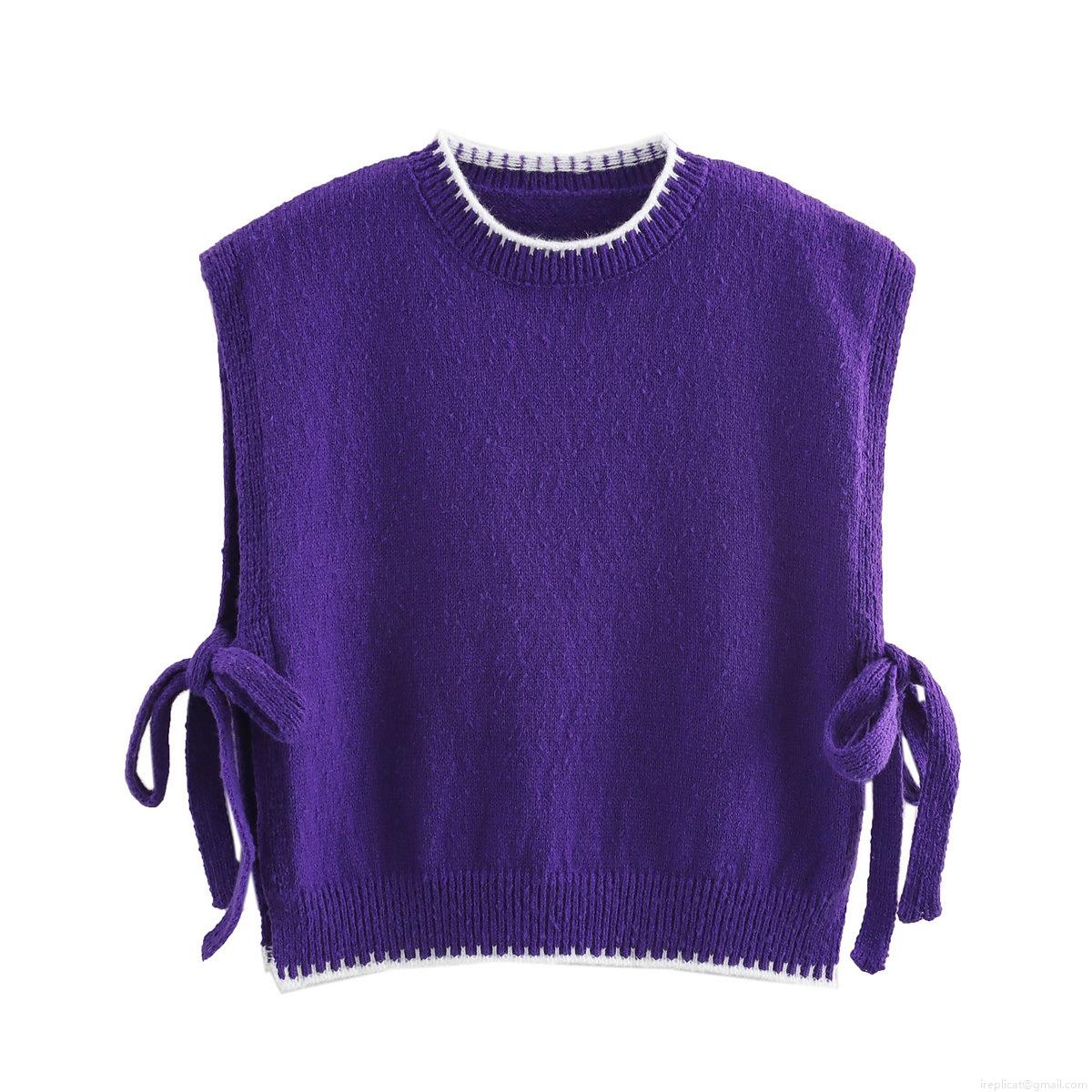 • Women Fashion Knitted Vest Sleeveless Round Neck Contrast Trim Side Lace-Up Knit Waistcoat Pullover Sweater Tank Top for Spring Autumn Casual Streetwear