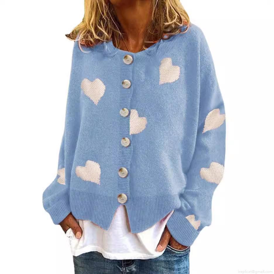 • Women Heart Pattern Knitted Cardigan Sweater Long Sleeve Single Breasted O-Neck Loose Fit Knit Outerwear Sweet Casual Fall Winter Tops