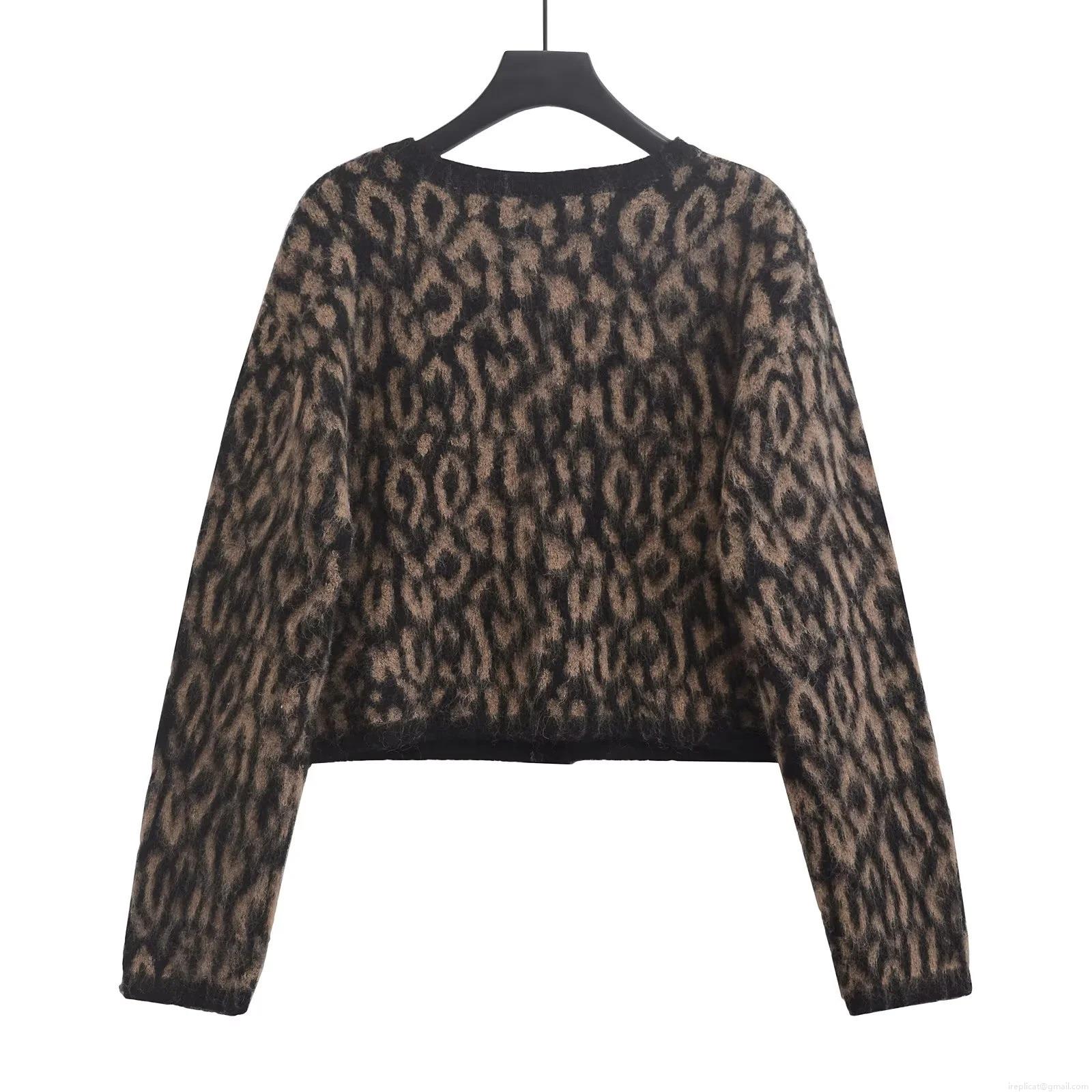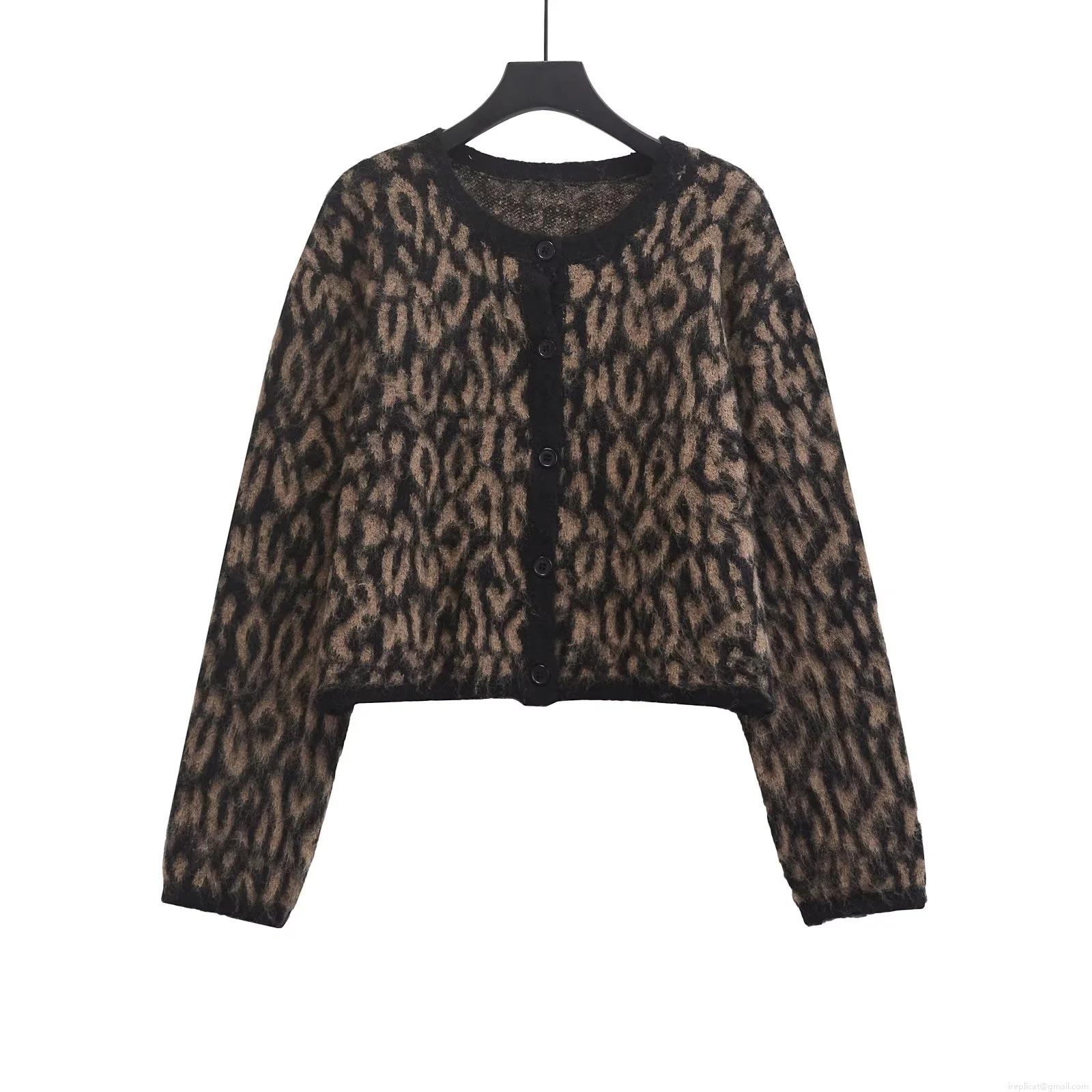 Women Leopard Print Cardigan Sweater Knitted Fuzzy Mohair Like Button Up Cropped Jacket Casual Loose Long Sleeve Outwear Fall Winter