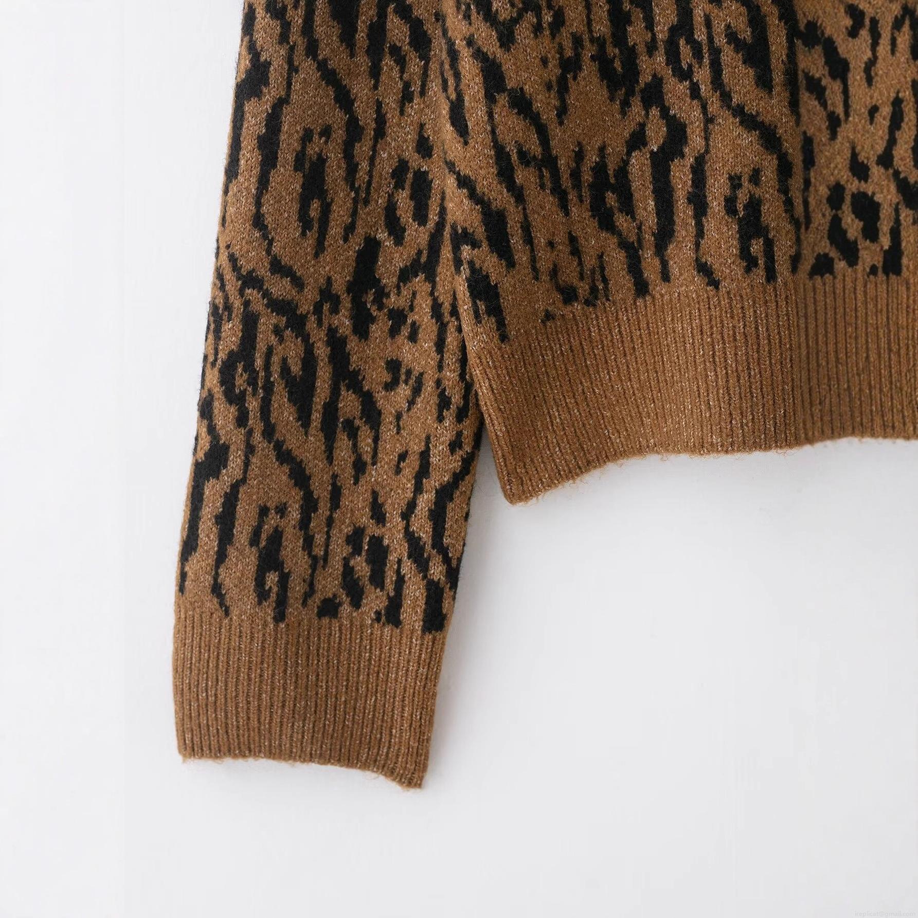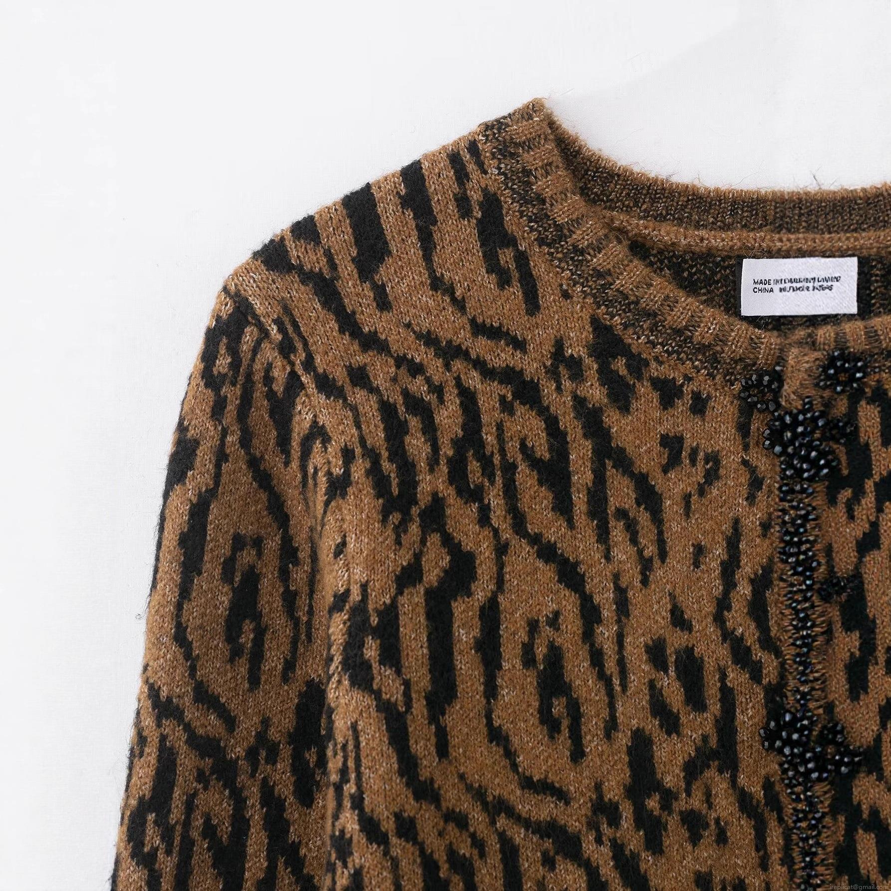 • Women Leopard Print Knitted Cardigan Sweater Round Neck Long Sleeve Single Breasted Beaded Flower Button Tops Autumn Winter Casual Street Style Knitwear