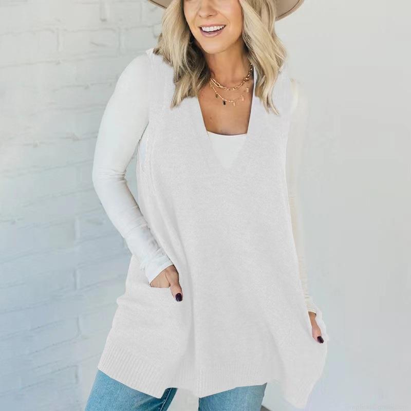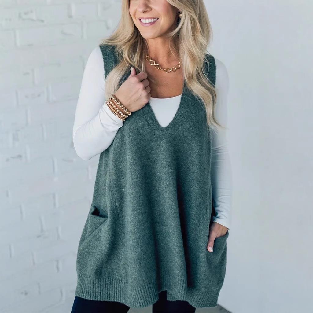 • Women Loose Knit Vest V Neck Sleeveless Sweater Side Pockets Casual Core Spun Yarn Layering Waistcoat Top Autumn Winter A-Line Pullover Knitwear