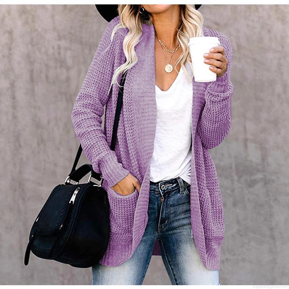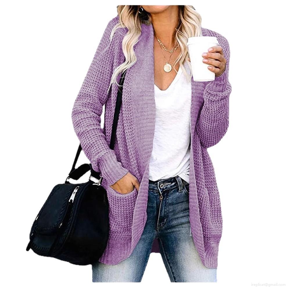 • Women Loose Waffle Knit Cardigan Mid Length Open Front Sweater With Pockets Casual Long Sleeve Knitted Coat Fall Winter Solid Outerwear