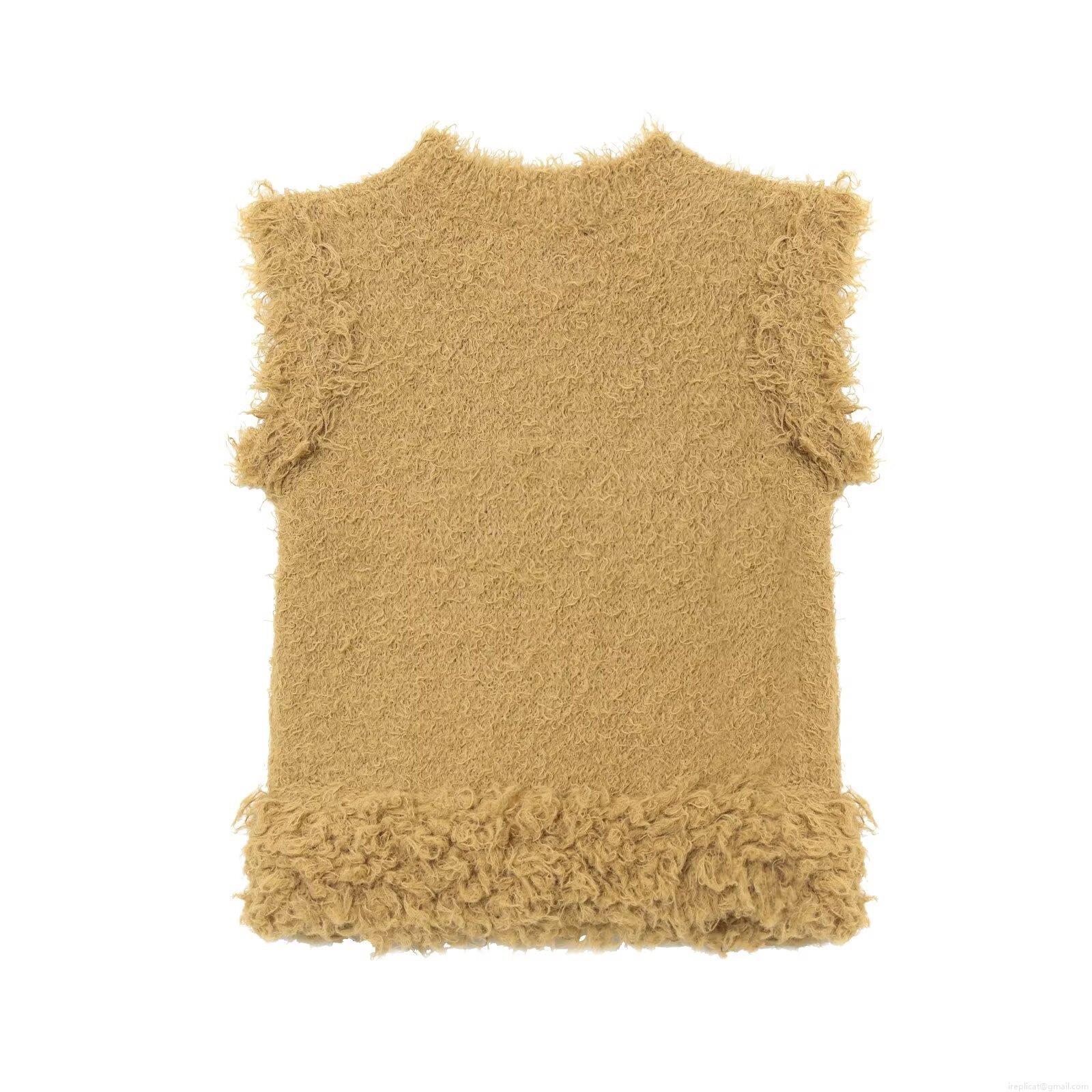 Women Mustard Yellow Faux Fur Knitted Vest Round Neck Sleeveless Fuzzy Pullover Waistcoat Casual Streetwear Autumn Winter Soft Plush Top