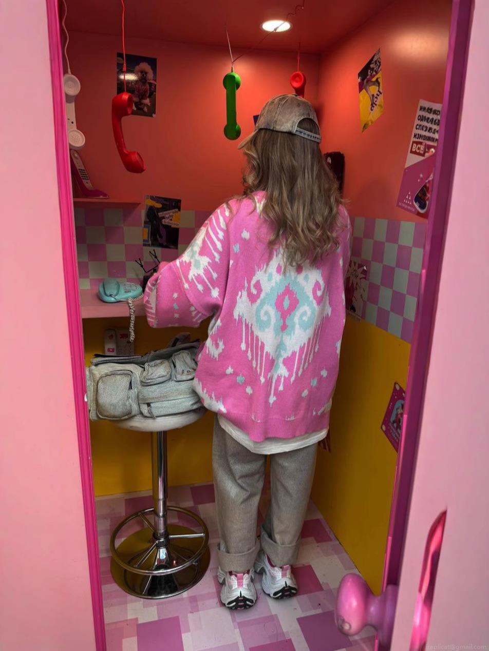 Women Retro Knitted Sweater Pink Color Block Jacquard Cotton Blend Crew Neck Long Sleeve Loose Pullover Jumper Casual Fall Winter Fashion Knitwear Top