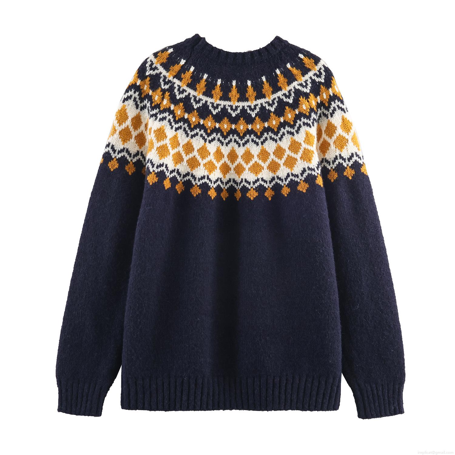 Women Retro Round Neck Fair Isle Jacquard Sweater Loose Long Sleeve Knit Pullover Top Autumn Winter Warm Soft Casual Oversized Knitwear