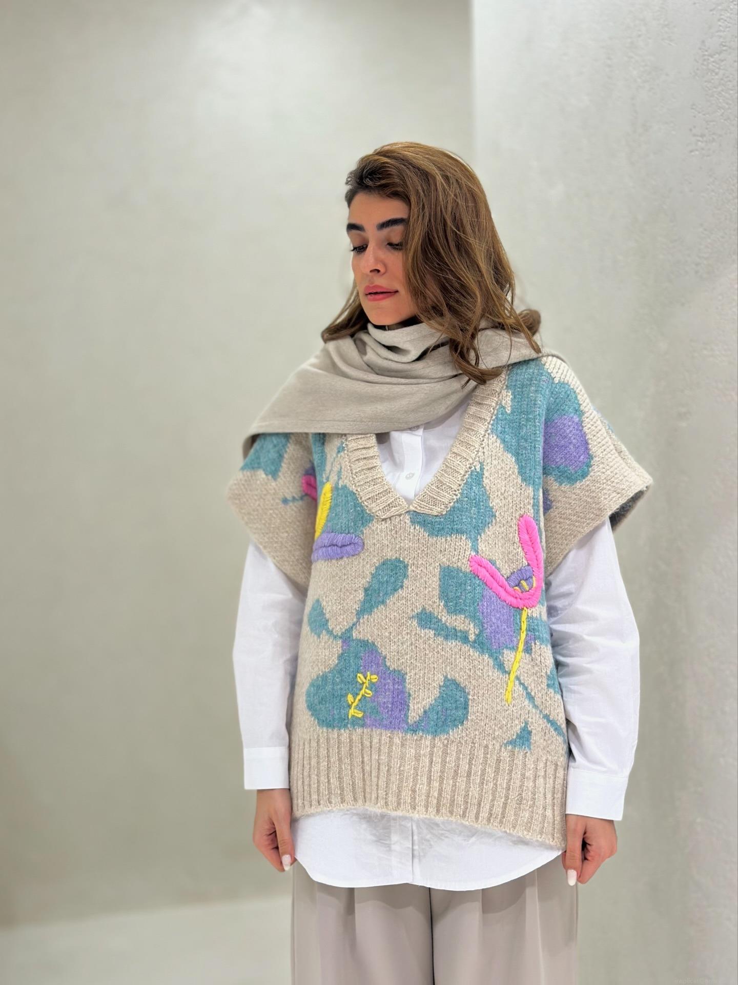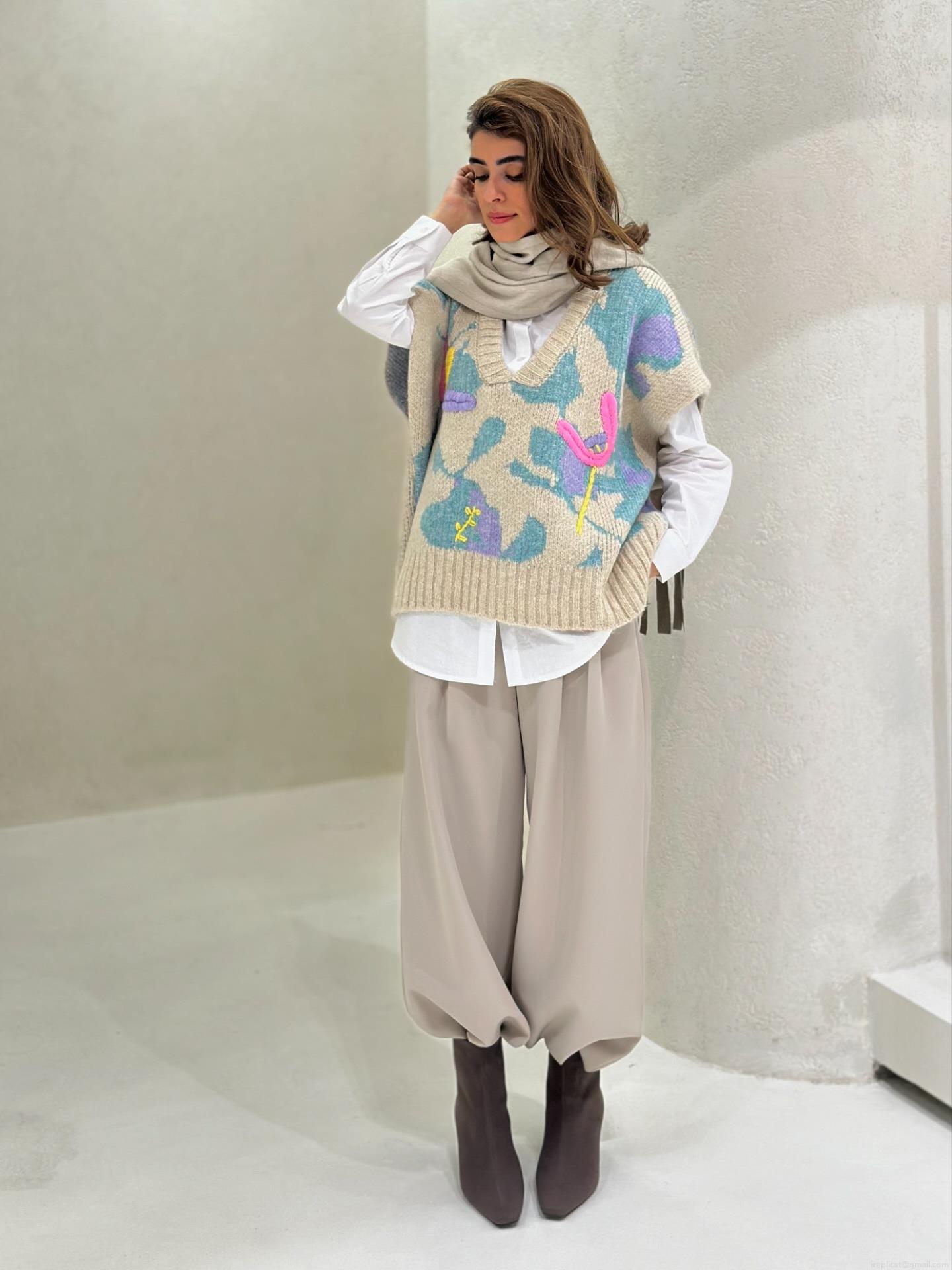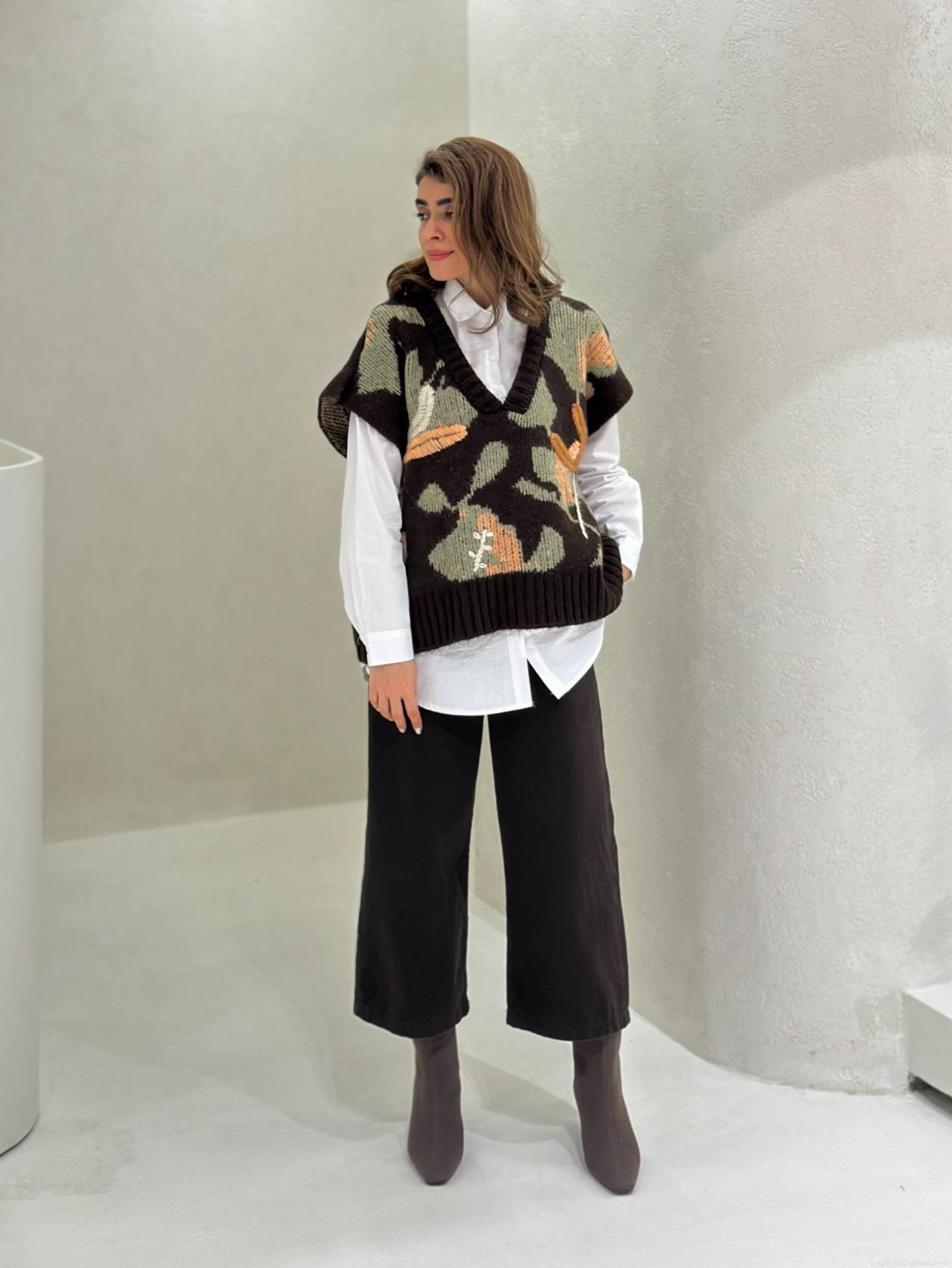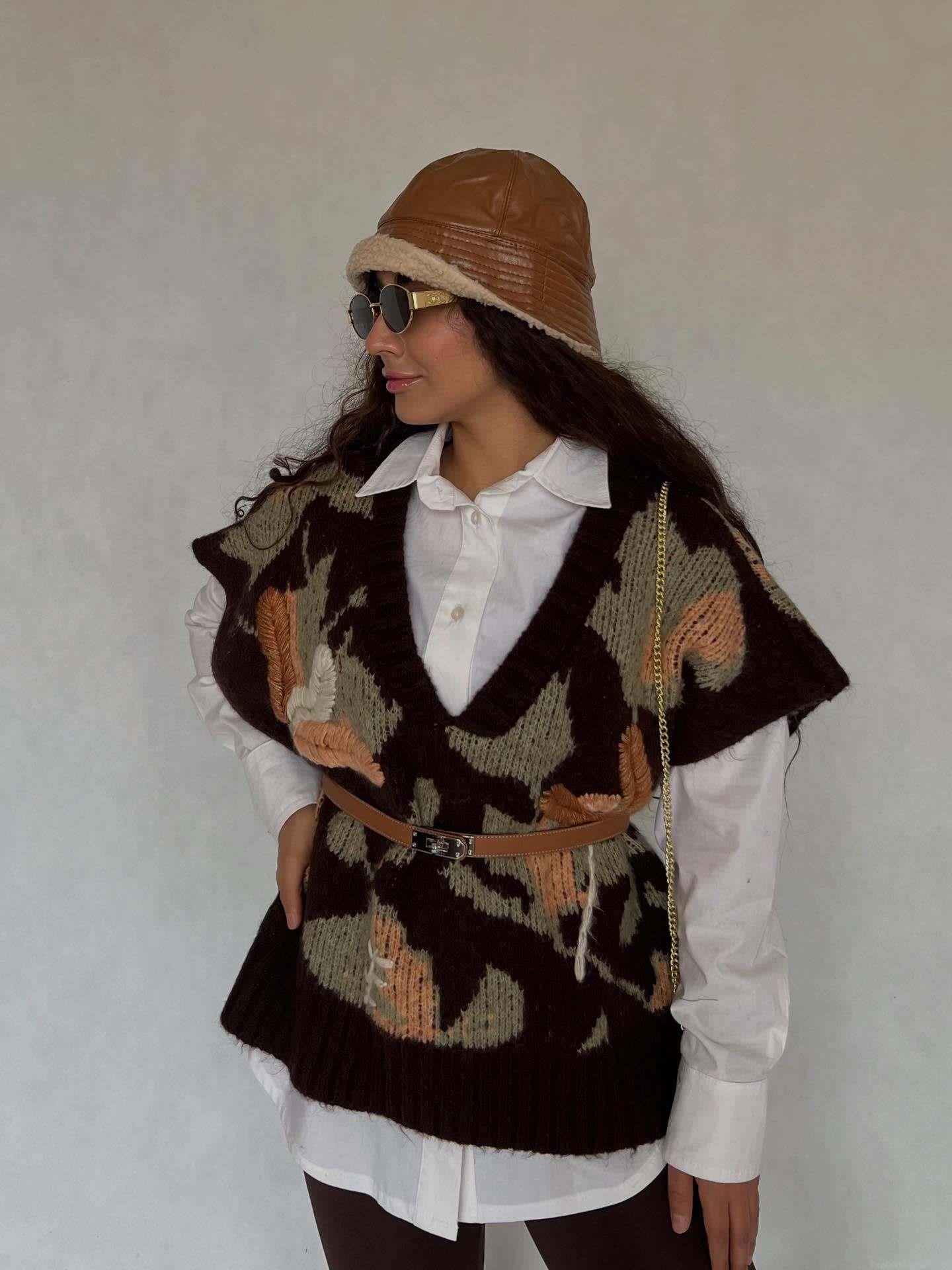 • Women V-Neck Knit Sweater Vest 80% Cotton Blend Abstract Floral Print Sleeveless Pullover Retro Old Money Style Casual Top For Spring Autumn Streetwear