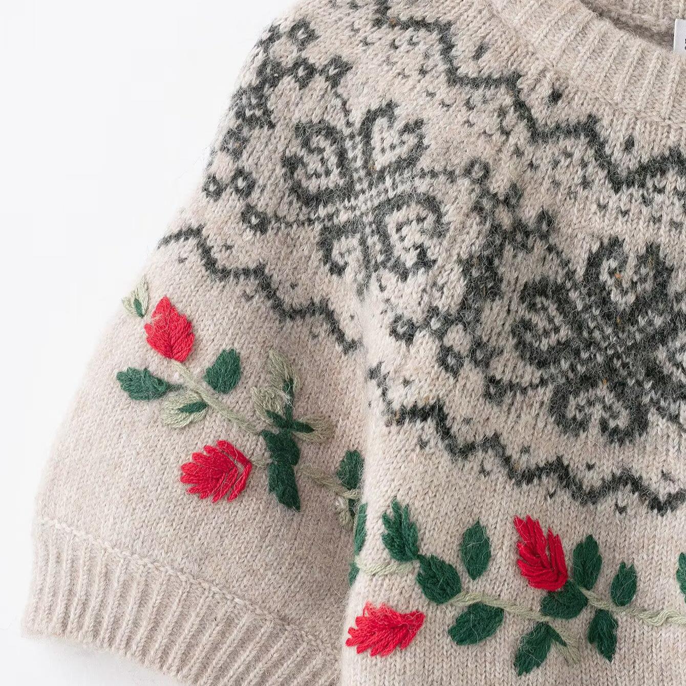 • Women's 100% Polyester Short Sleeve Knit Sweater Round Neck Pullover Retro Floral Embroidery Fair Isle Geometric Pattern Beige Knitwear Top