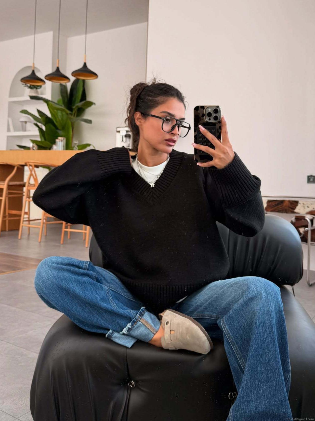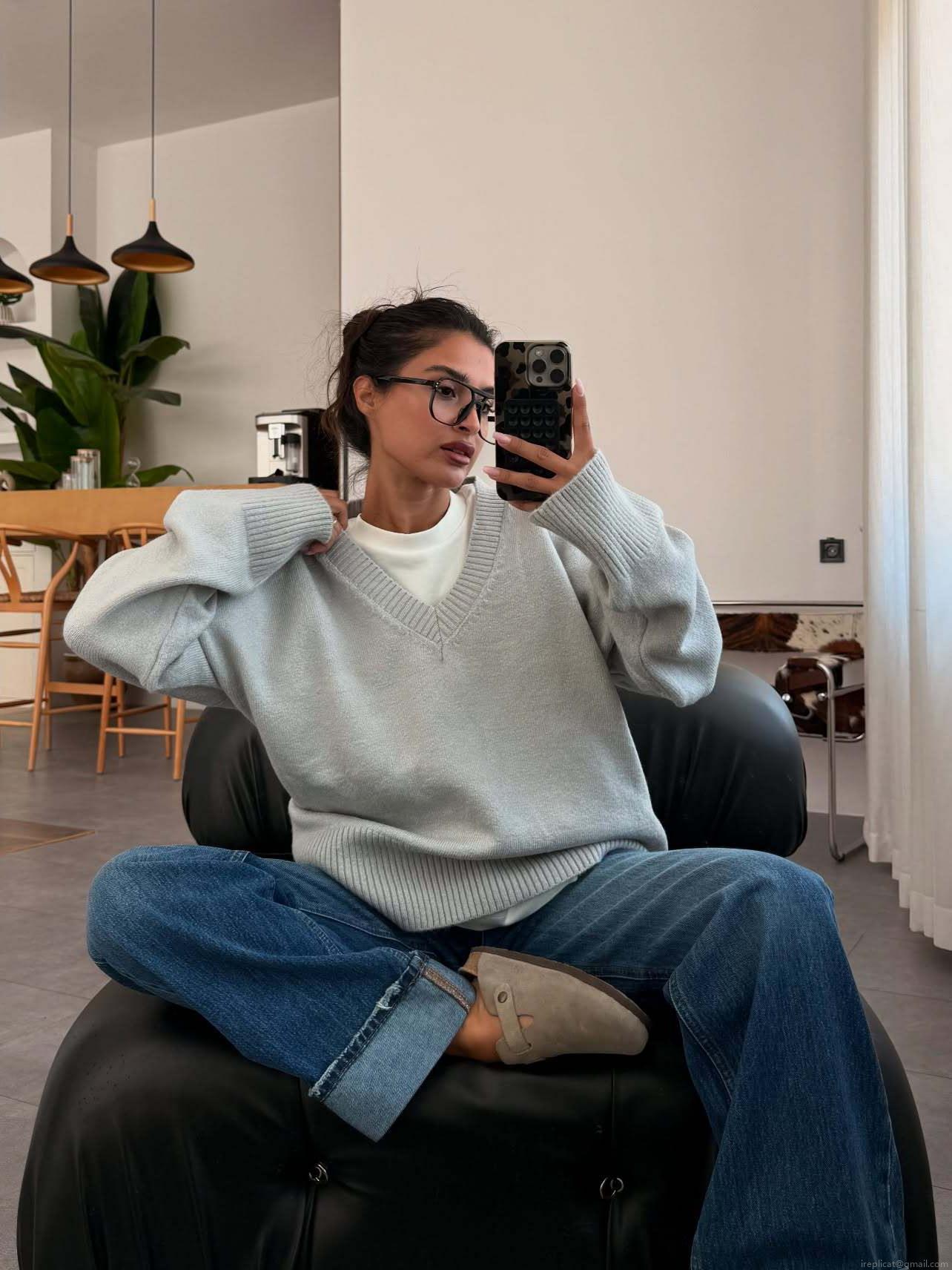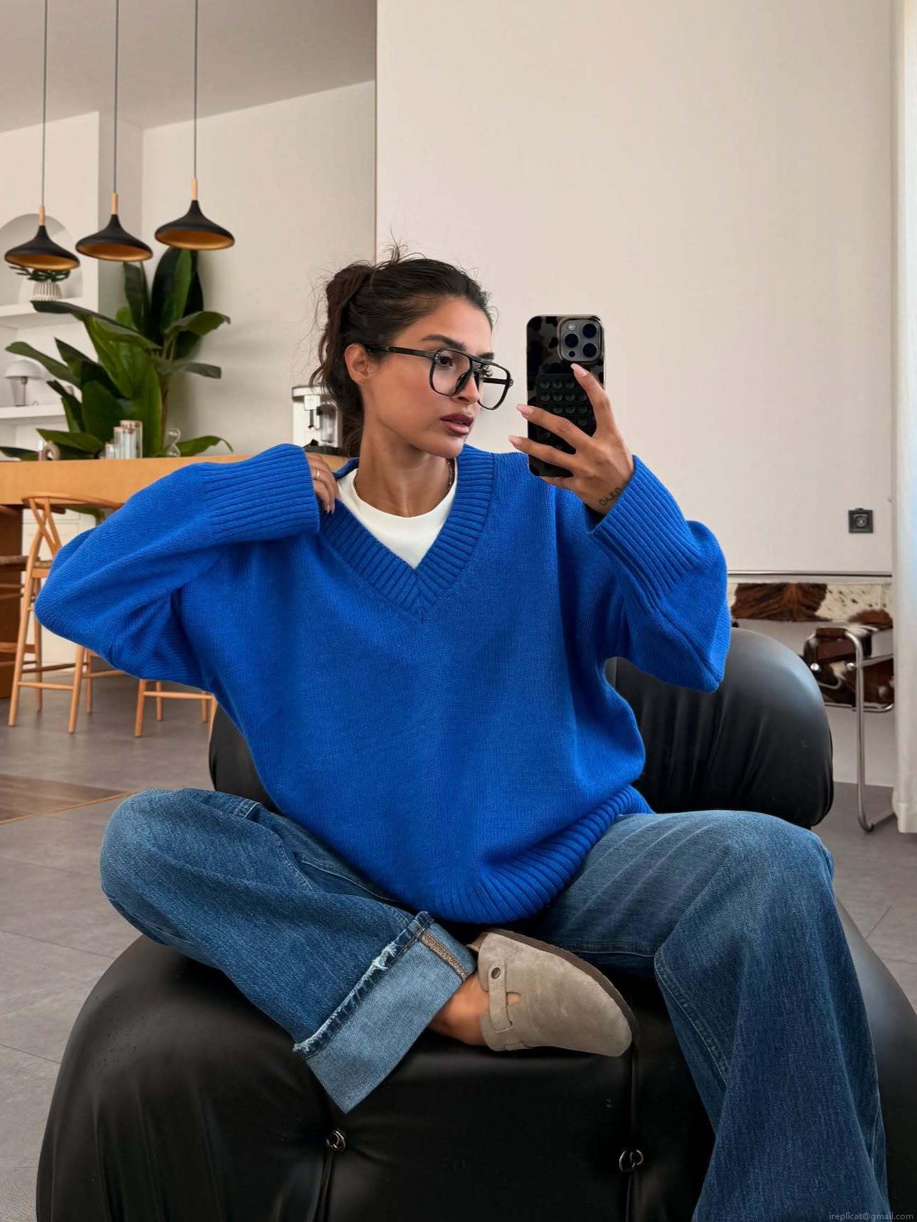 • Women's American Retro Street Style V-Neck Sweater 80% Cotton 20% Polyester Knitted Long Sleeve Loose Fit Oversized Solid Color Warm Pullover Top For Autumn Winter Lazy Style