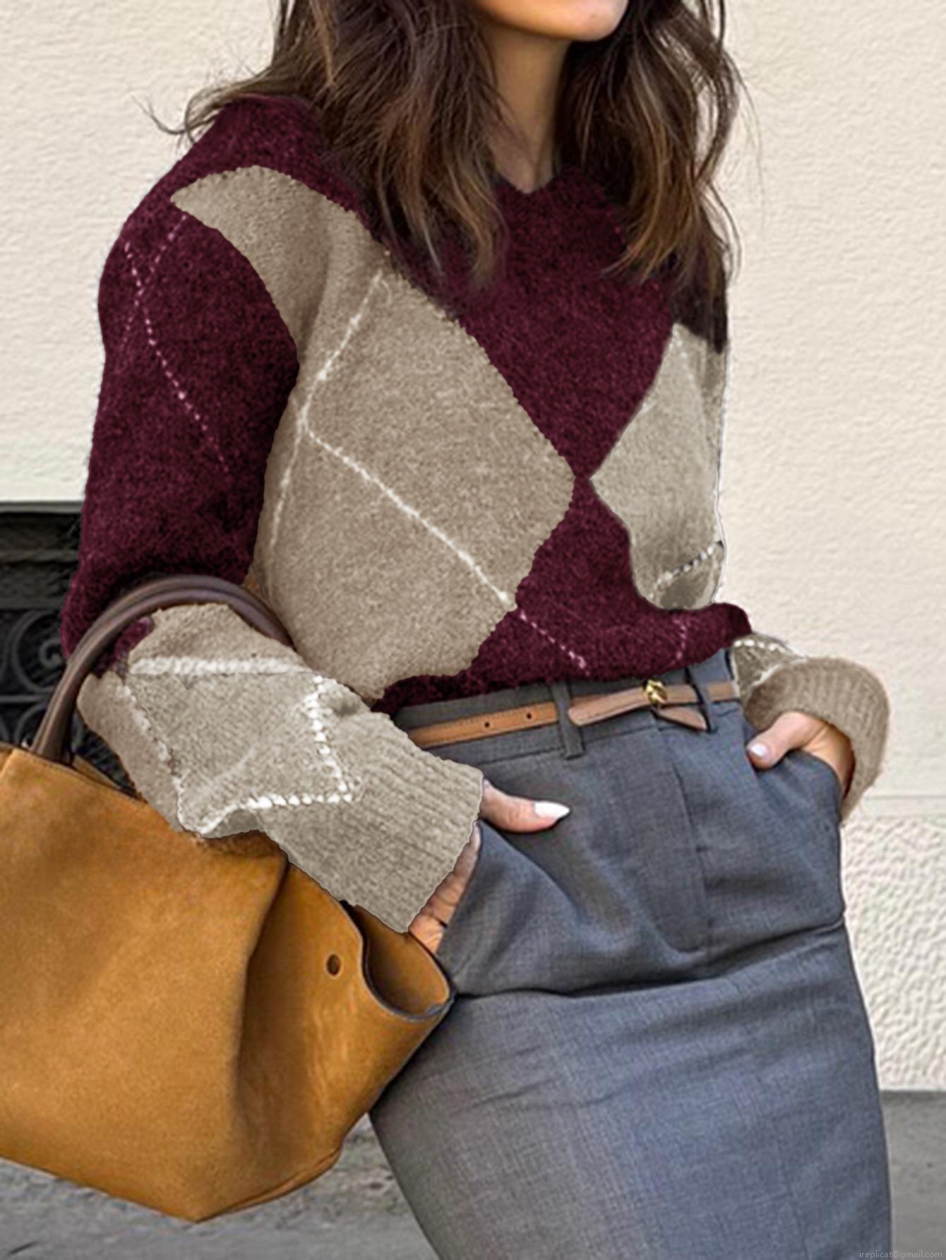 • Women's Argyle Knit Sweater Patchwork Long Sleeve V Neck Loose Pullover Acrylic Polyamide Polyester Blend Casual Elegant Winter Knitwear Top