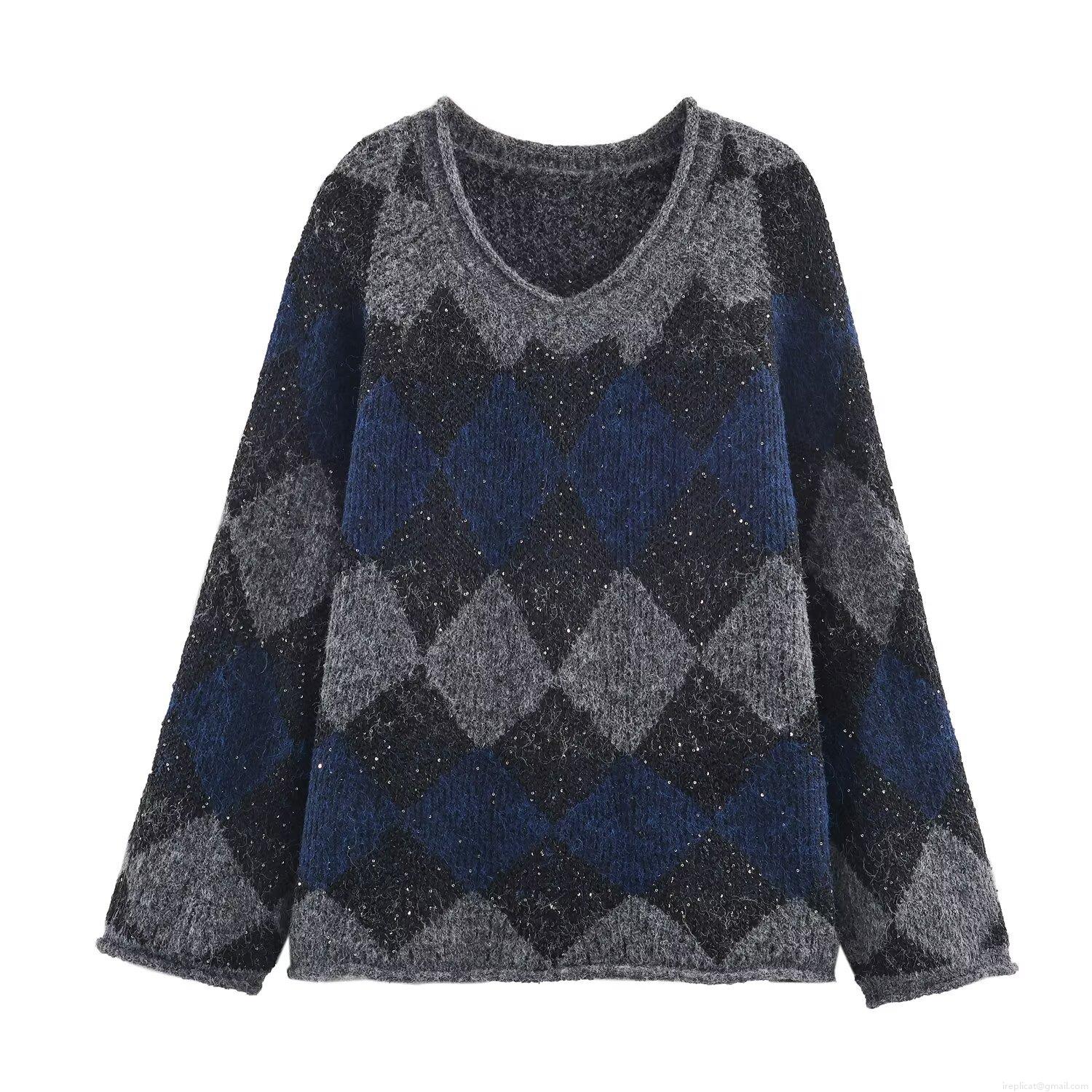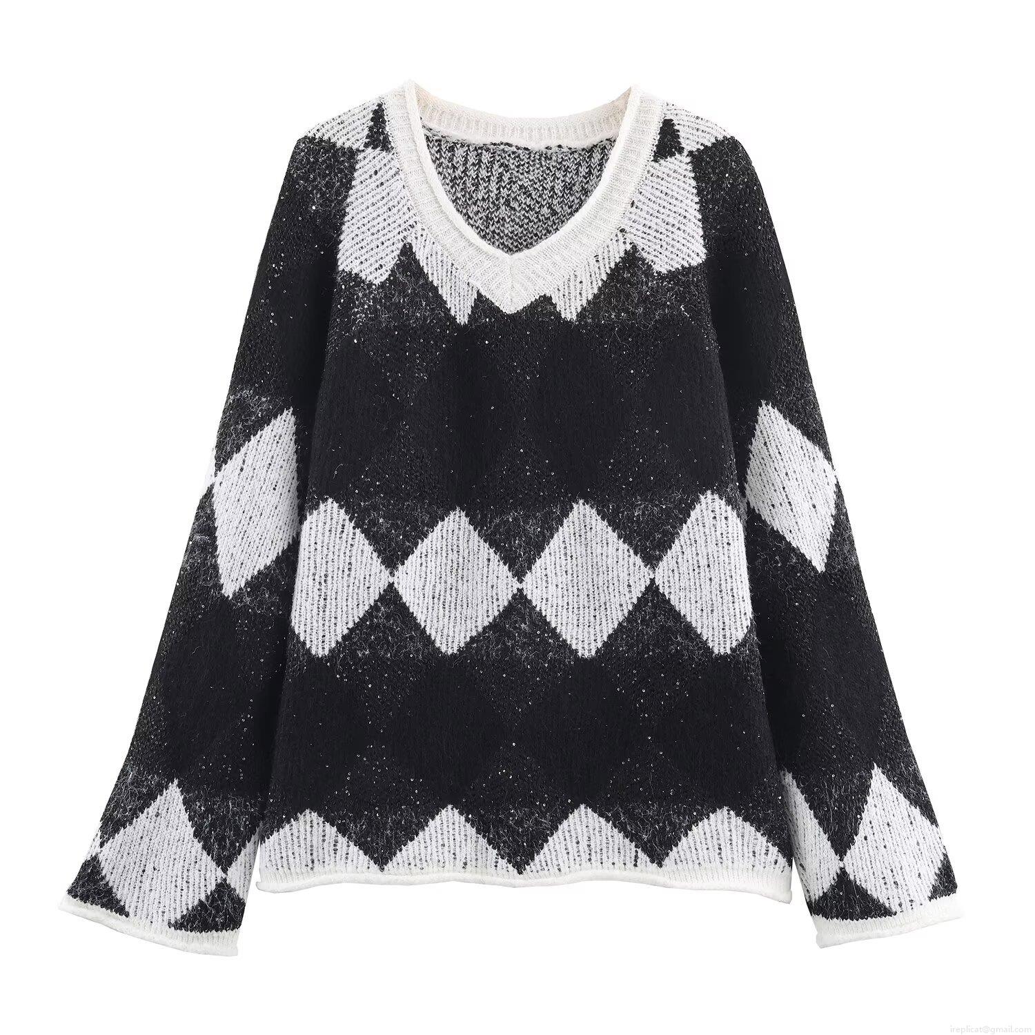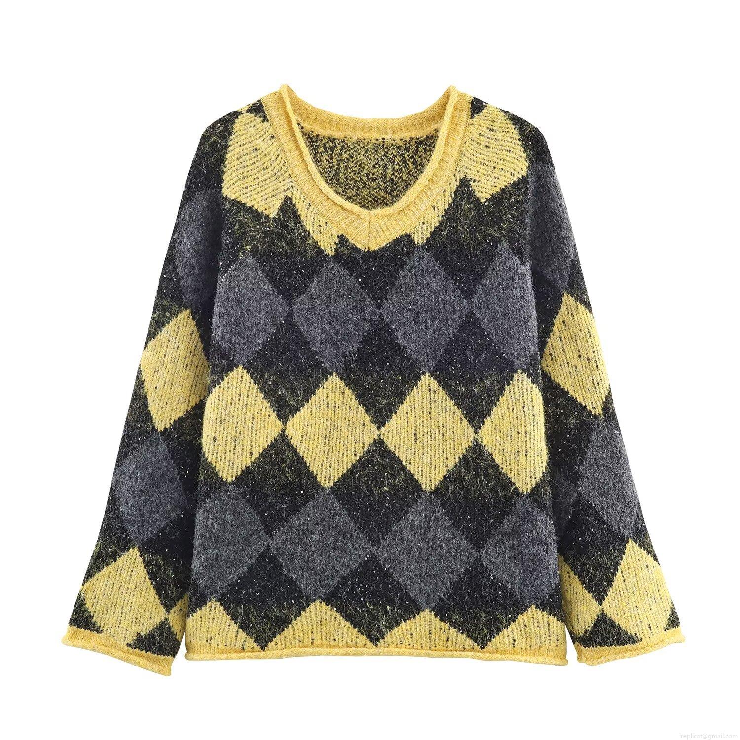 • Women's Argyle V-Neck Knit Sweater Contrast Color Long Sleeve Pullover With Shiny Sequins Casual Autumn Winter Geometric Knitwear Jumper Tops