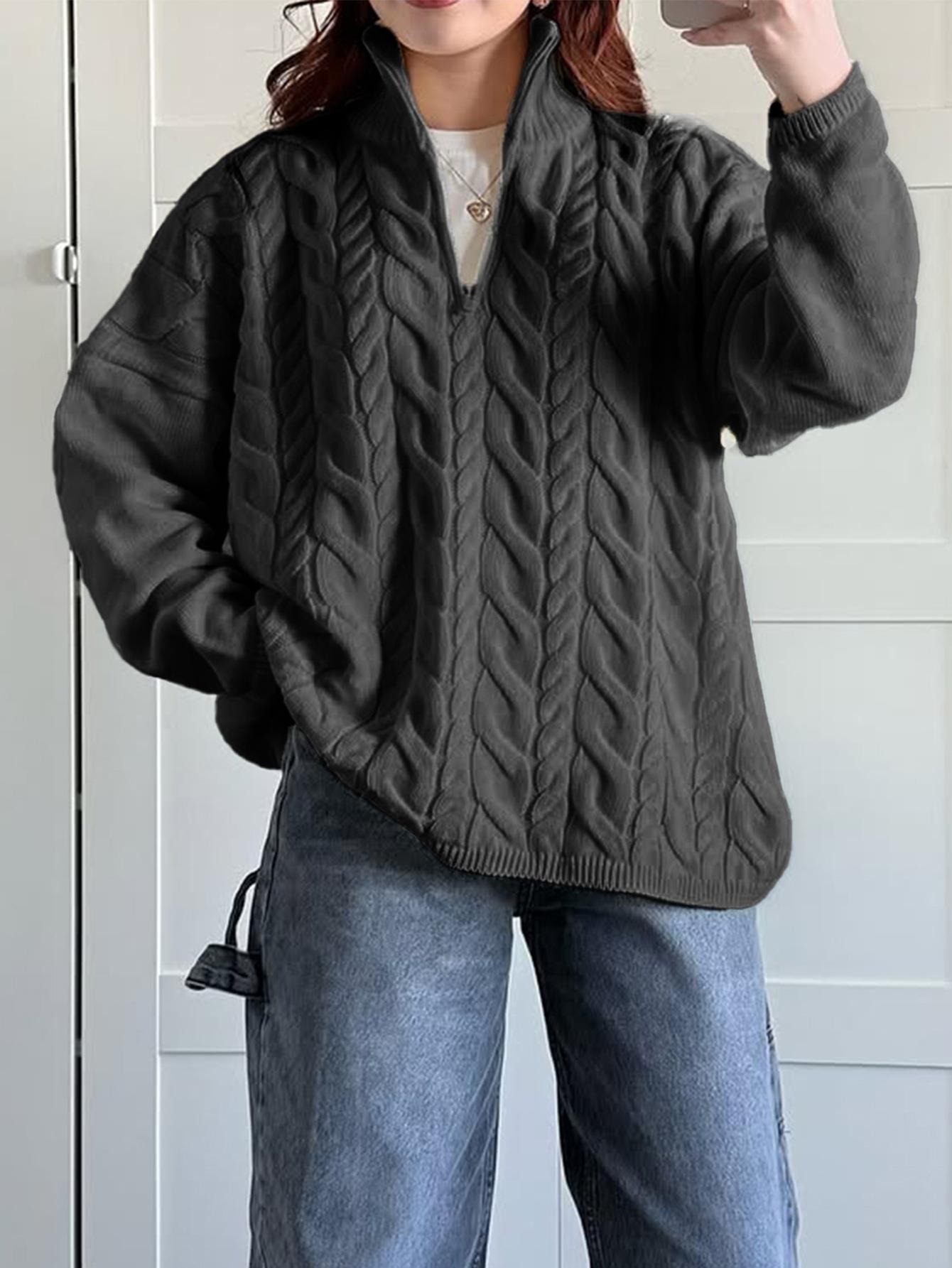 • Women's Cable Knit Sweater Half Zip Mock Neck Loose Fit Solid Color Polyester Acrylic Blend Long Sleeve Jumper For Casual Vacation Autumn Winter