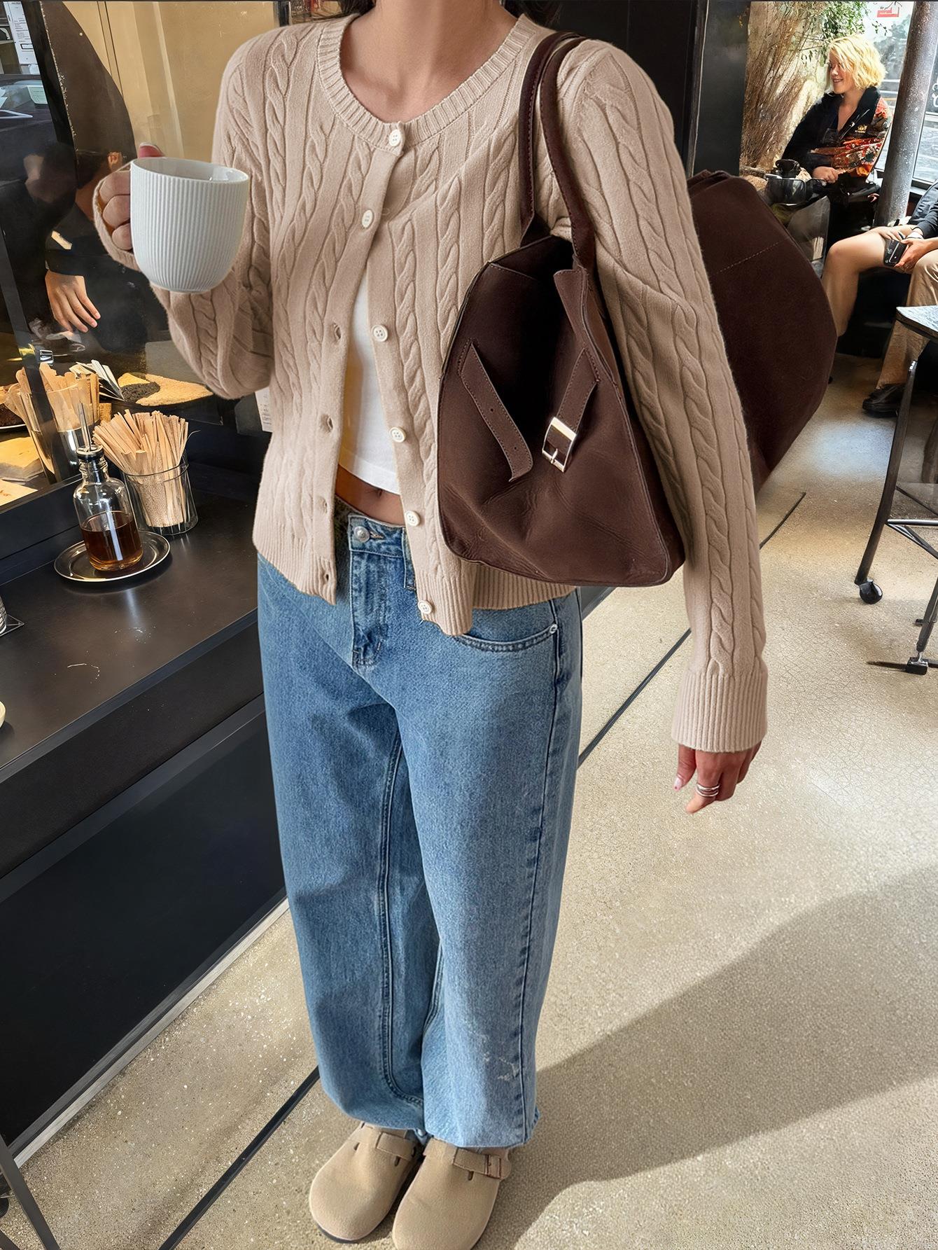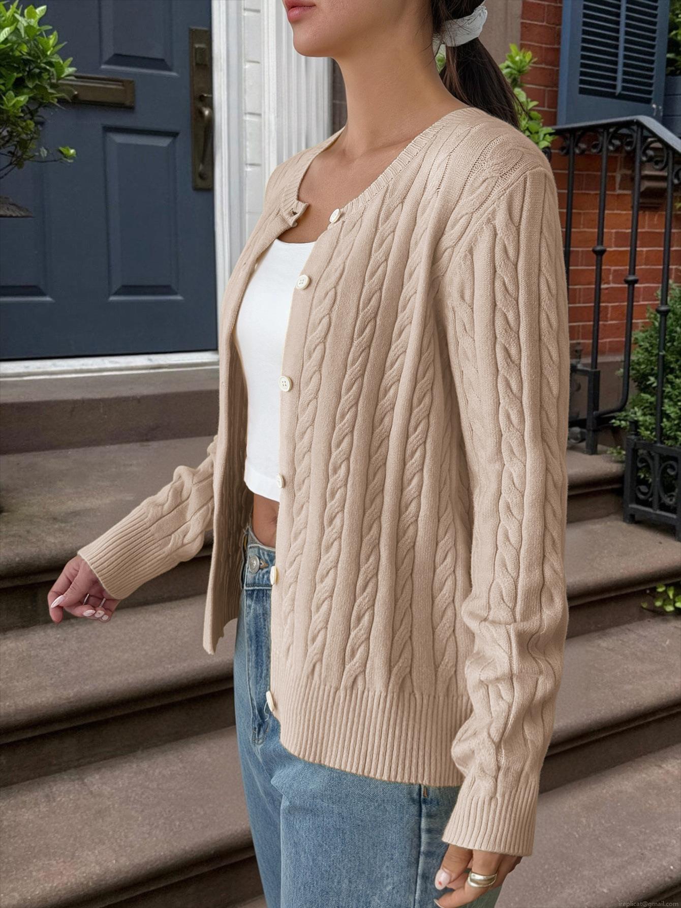 • Women's Casual Cable Knit Cardigan Sweater Viscose Polyester Polyamide Blend Button Front Round Neck Long Sleeve Knitwear for Daily Vacation Autumn Winter