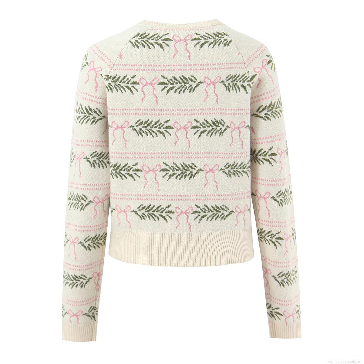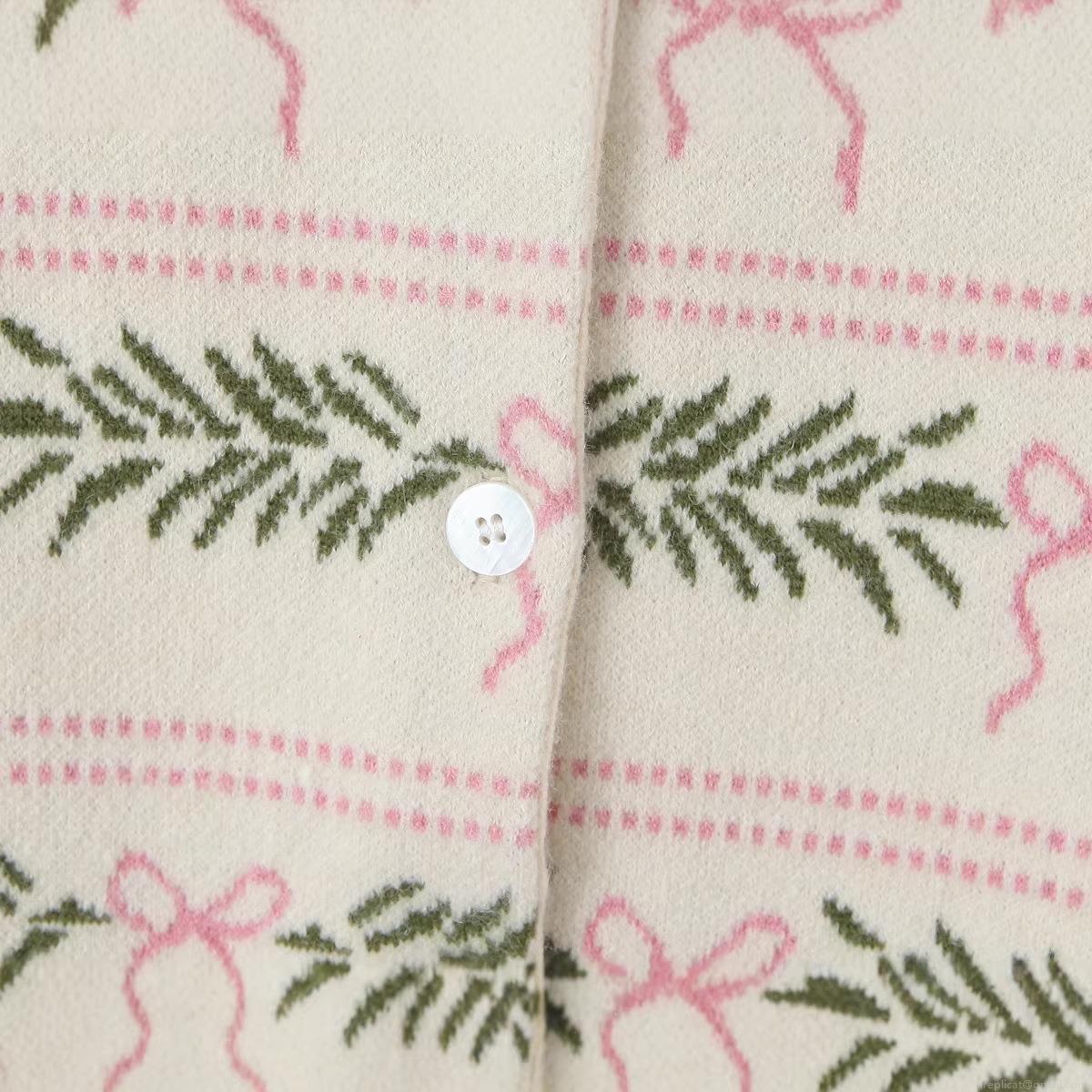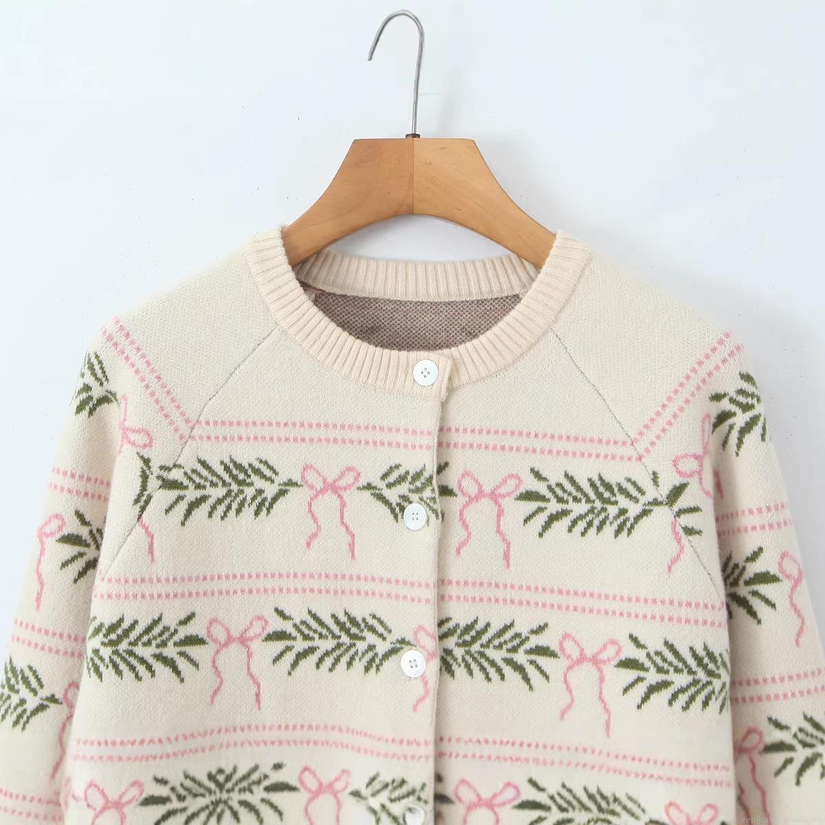 • Women's Casual European Style Cotton Blend Knit Cardigan Sweater Round Neck Single-Breasted Long Sleeve Embroidered Pink Bow Green Leaf Pattern Sweet Top