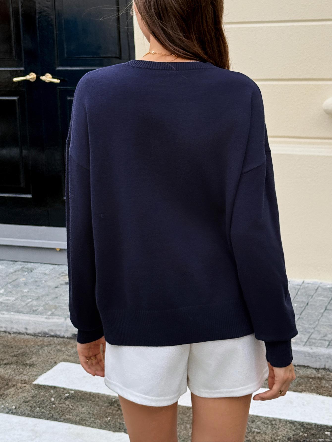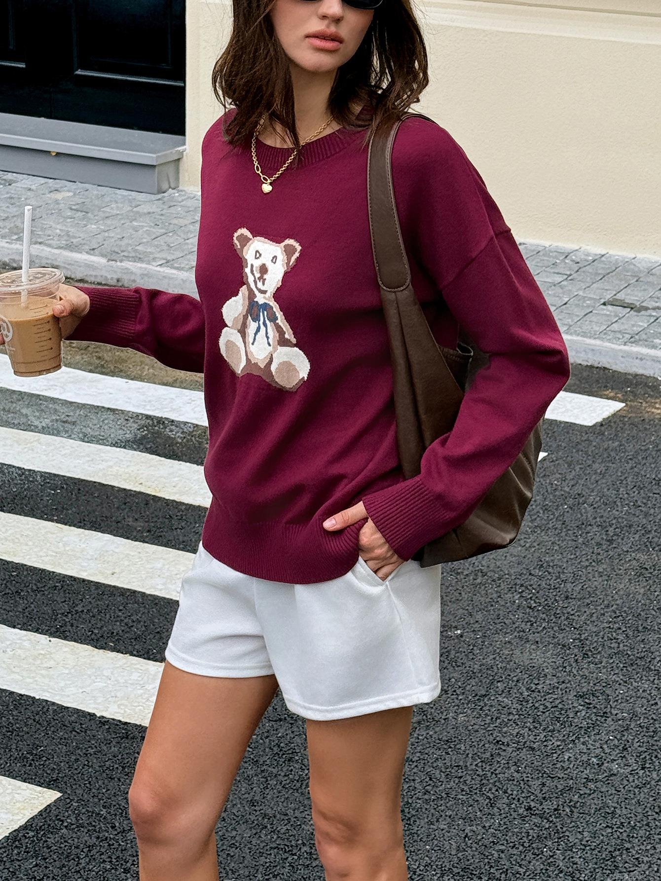 • Women's Casual Knit Sweater Viscose Blend Long Sleeve Round Neck Loose Fit Teddy Bear Jacquard Pullover For Autumn Winter Daily Vacation