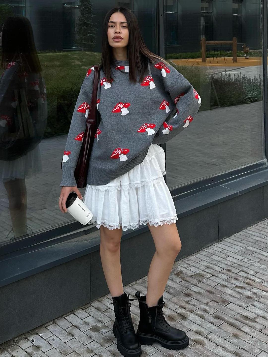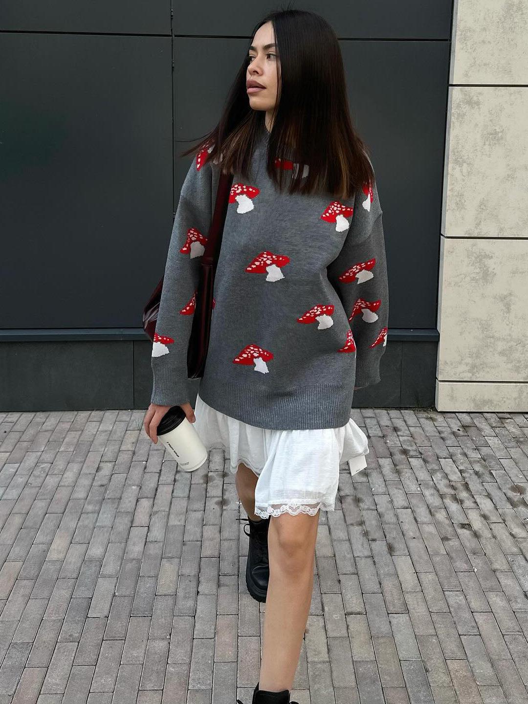 • Women's Casual Mushroom Print Knitted Sweater Cotton Blend Oversize Crew Neck Long Sleeve Pullover Grey Black Aesthetic Knitwear Top