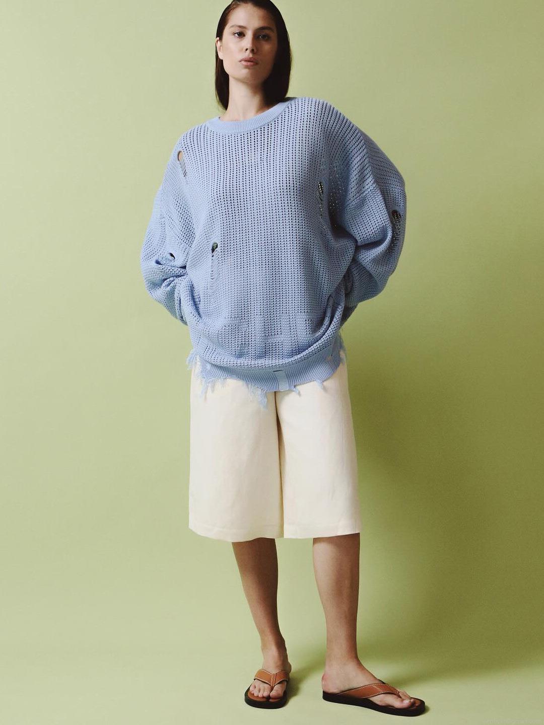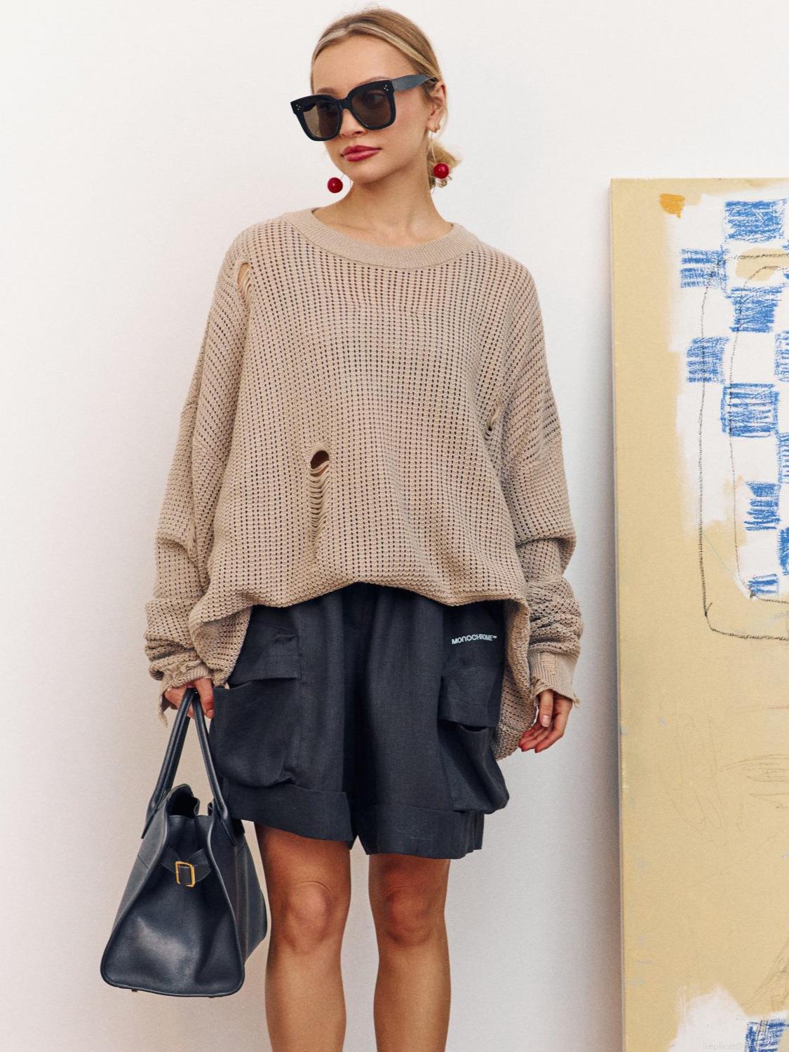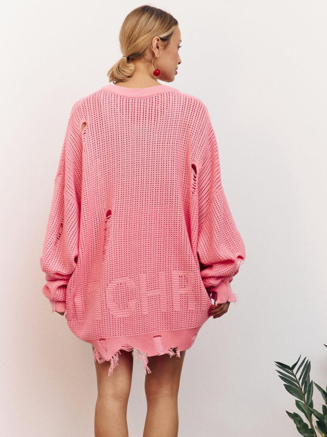 • Women's Casual Oversized Distressed Hollow Out Knit Sweater Cotton Acrylic Blend Lazy Style Round Neck Long Sleeve Pullover Tops Streetwear