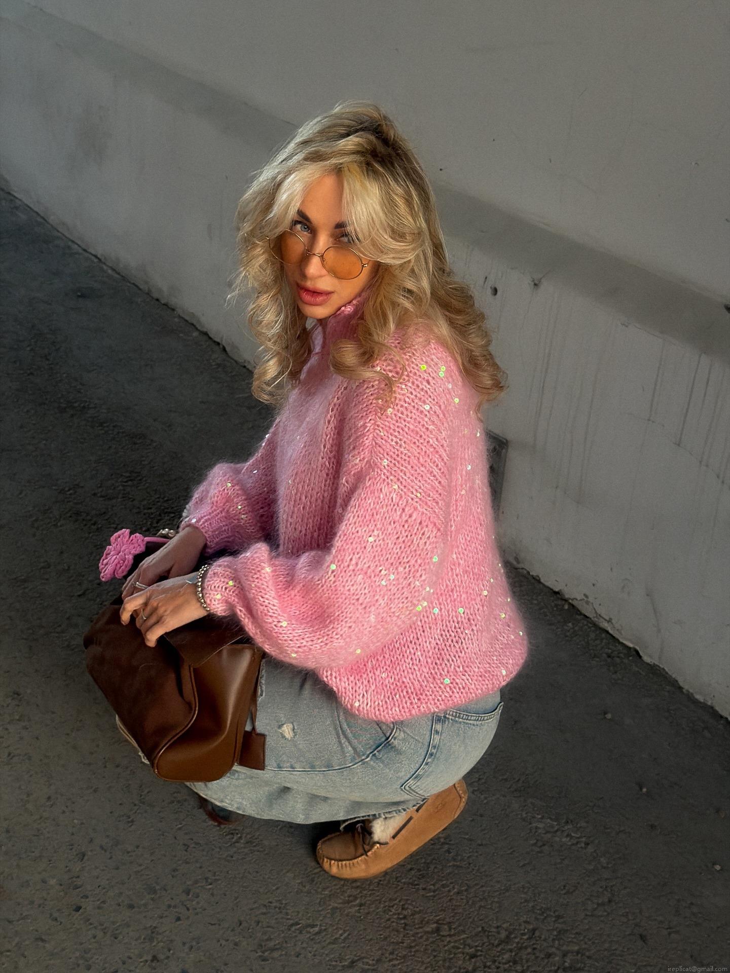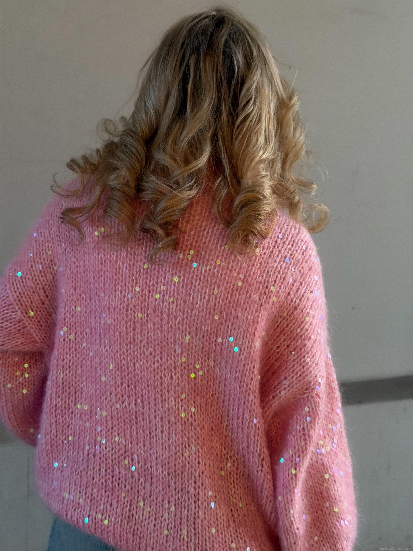 • Women's Casual Pink Sequin Knit Sweater Half Zipper Pullover Loose Long Sleeve Soft Warm Cotton Blend Knitwear For Autumn Winter