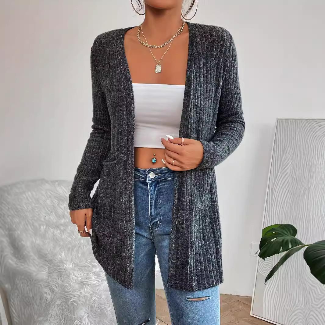 Solid Color, Ribbed Strip, Side Pockets, Open-front Design, Floral Yarn Texture