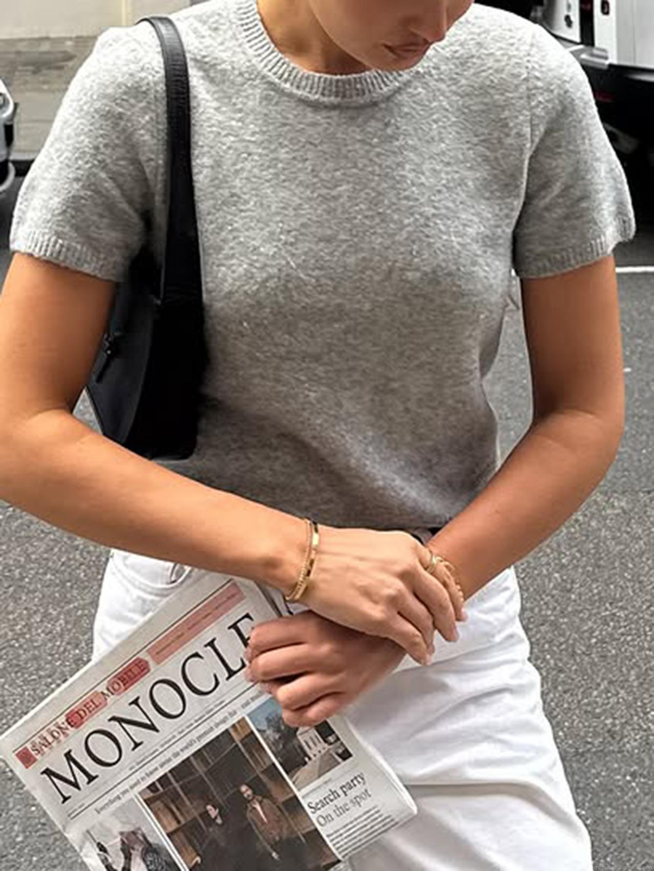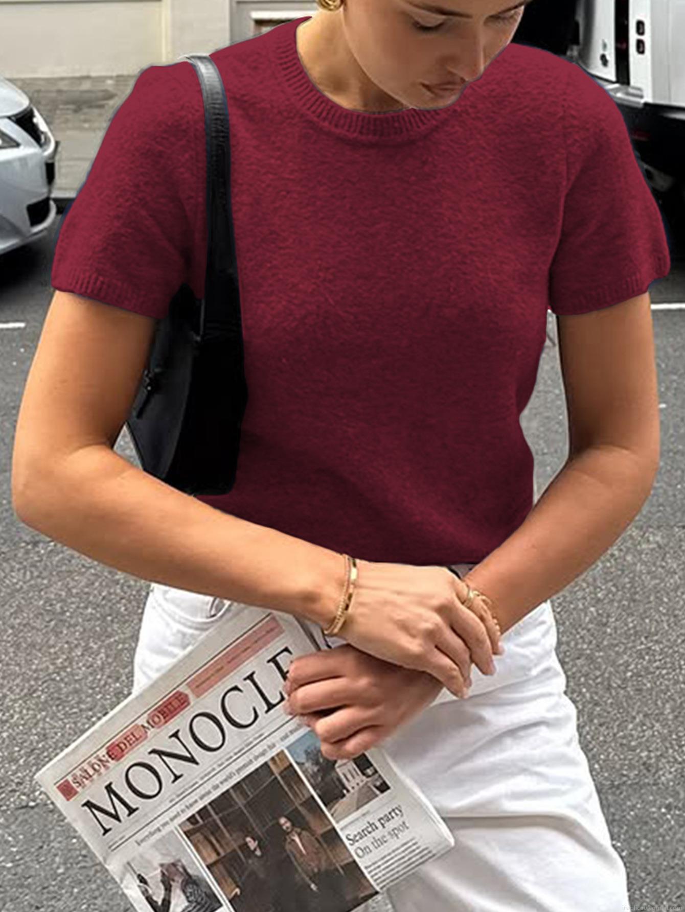 • Women's Casual Short Sleeve Knit T-Shirt Slim Fit Crew Neck Pullover Solid Color Acrylic Polyamide Wool Blend Top For Autumn Winter Streetwear