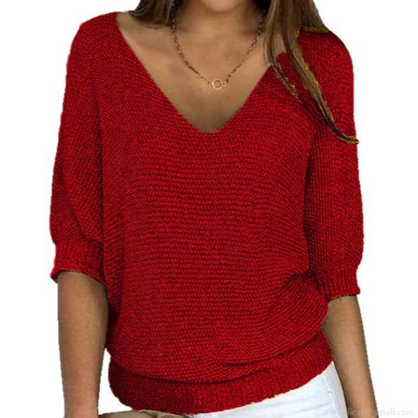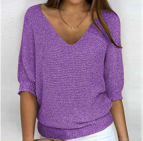 • Women's Casual V Neck 3/4 Sleeve Knit Sweater Loose Batwing Sleeve Solid Color Polyester Pullover Top For Daily Wear Soft Knitwear