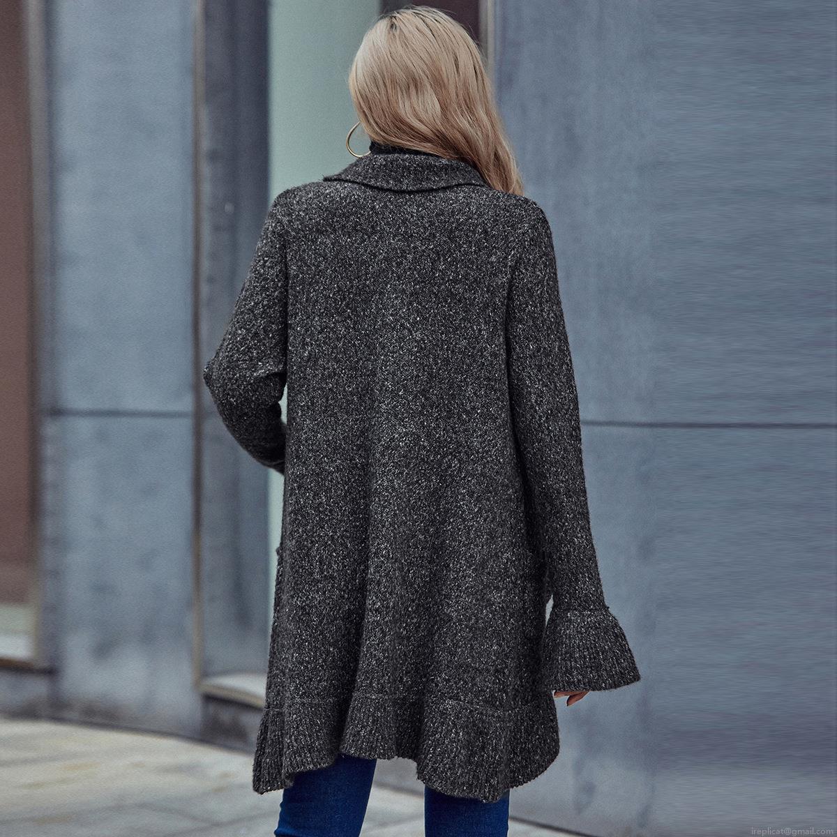 • Women's Chic Long Knitted Cardigan Sweater Ruffle Trim Lapel Collar Loose Fit Open Front Knitted Fabric Jacket Coat With Pockets Solid Heather Gray Casual Streetwear For Women