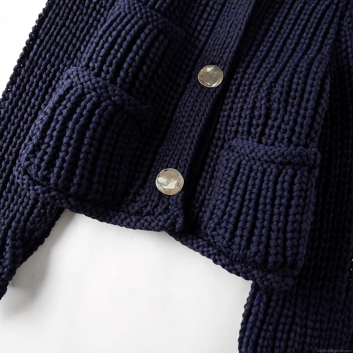 Women's Chunky Knit Short Sweater Navy Blue Round Neck Long Sleeve Button Cardigan Knitwear Streetwear Casual Soft Warm Autumn Winter Top