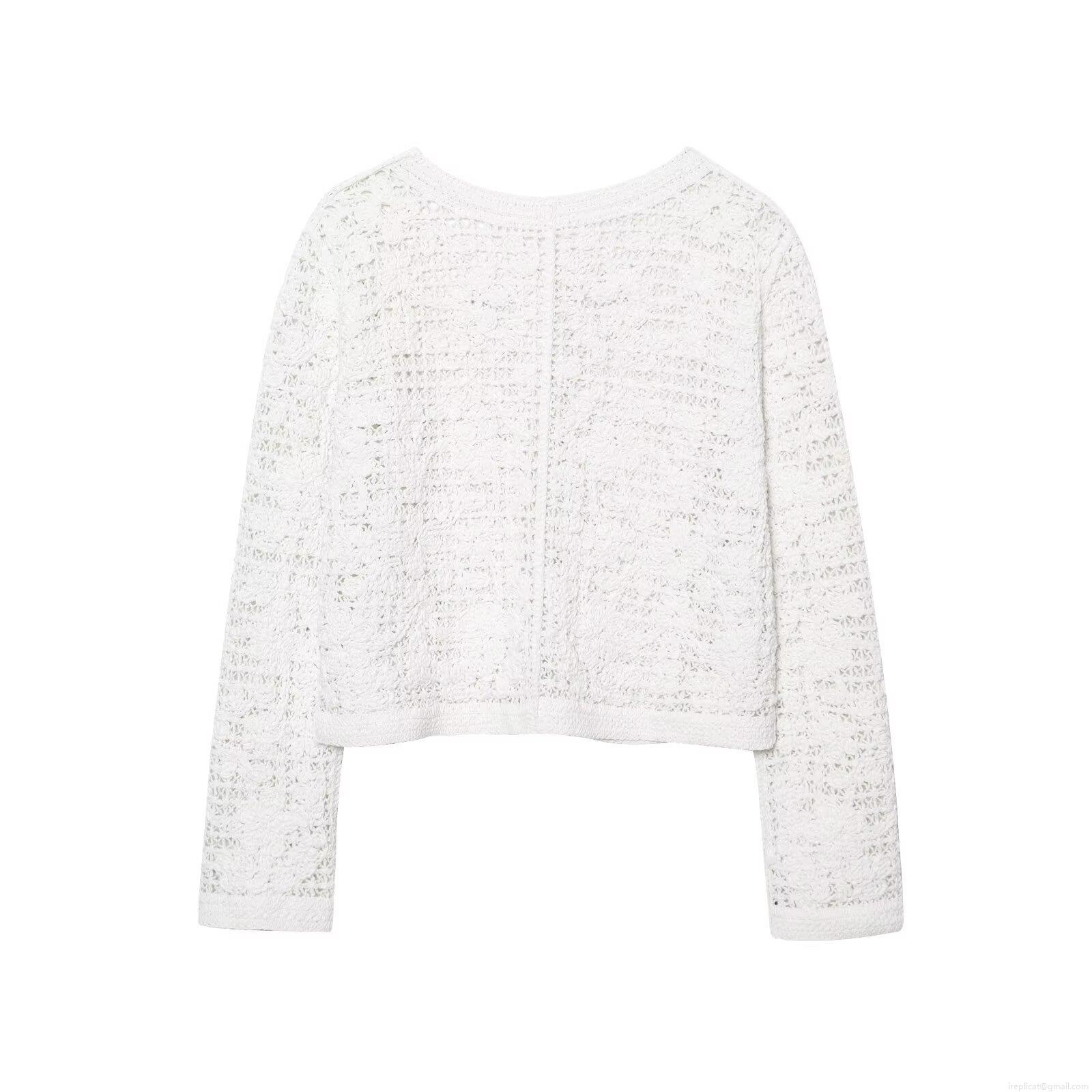 Women's Crochet Lace Cardigan Long Sleeve Hollow Out Knit Top Round Neck Button Down White Cropped Jacket Elegant Party Outerwear For Women