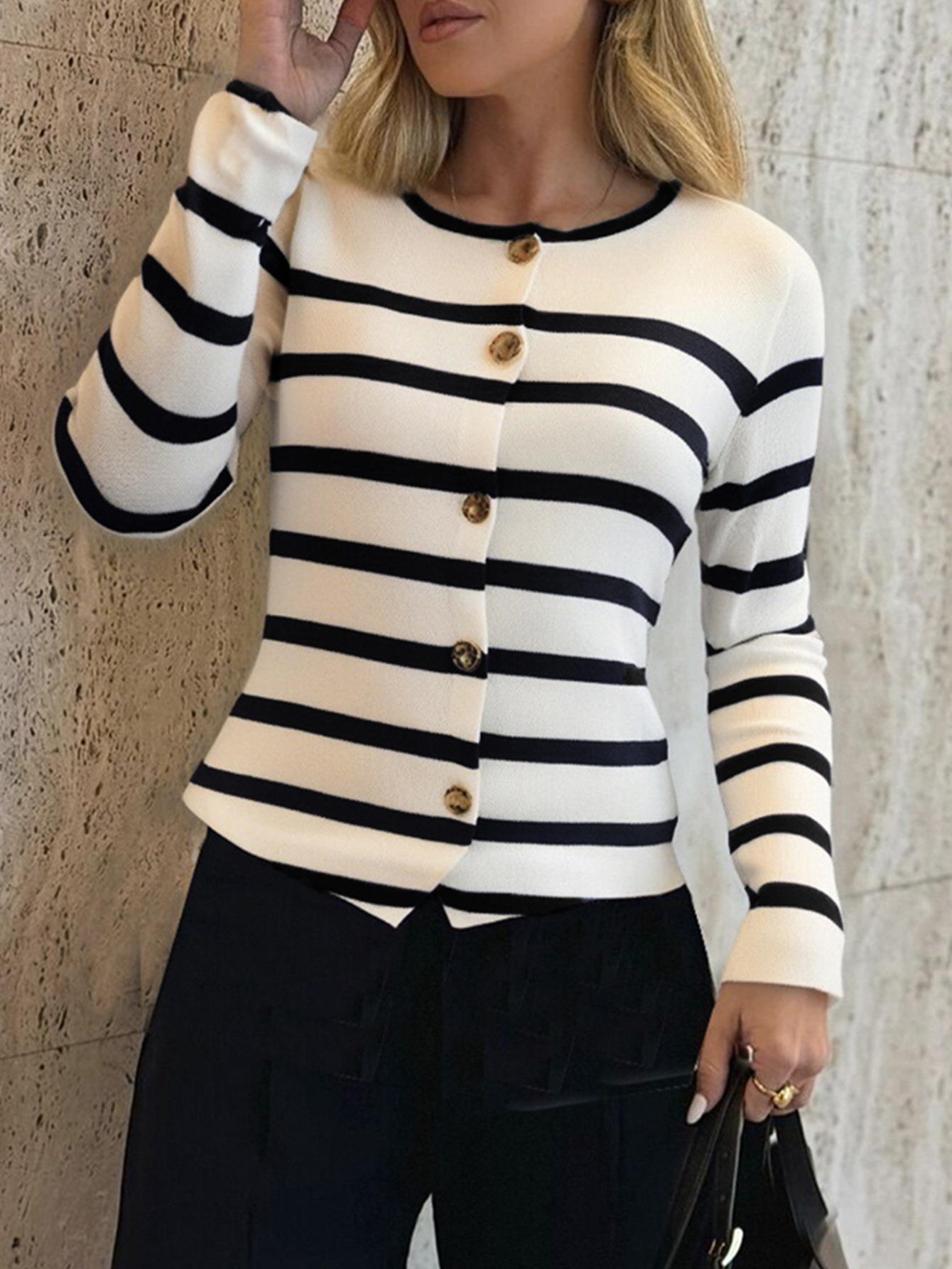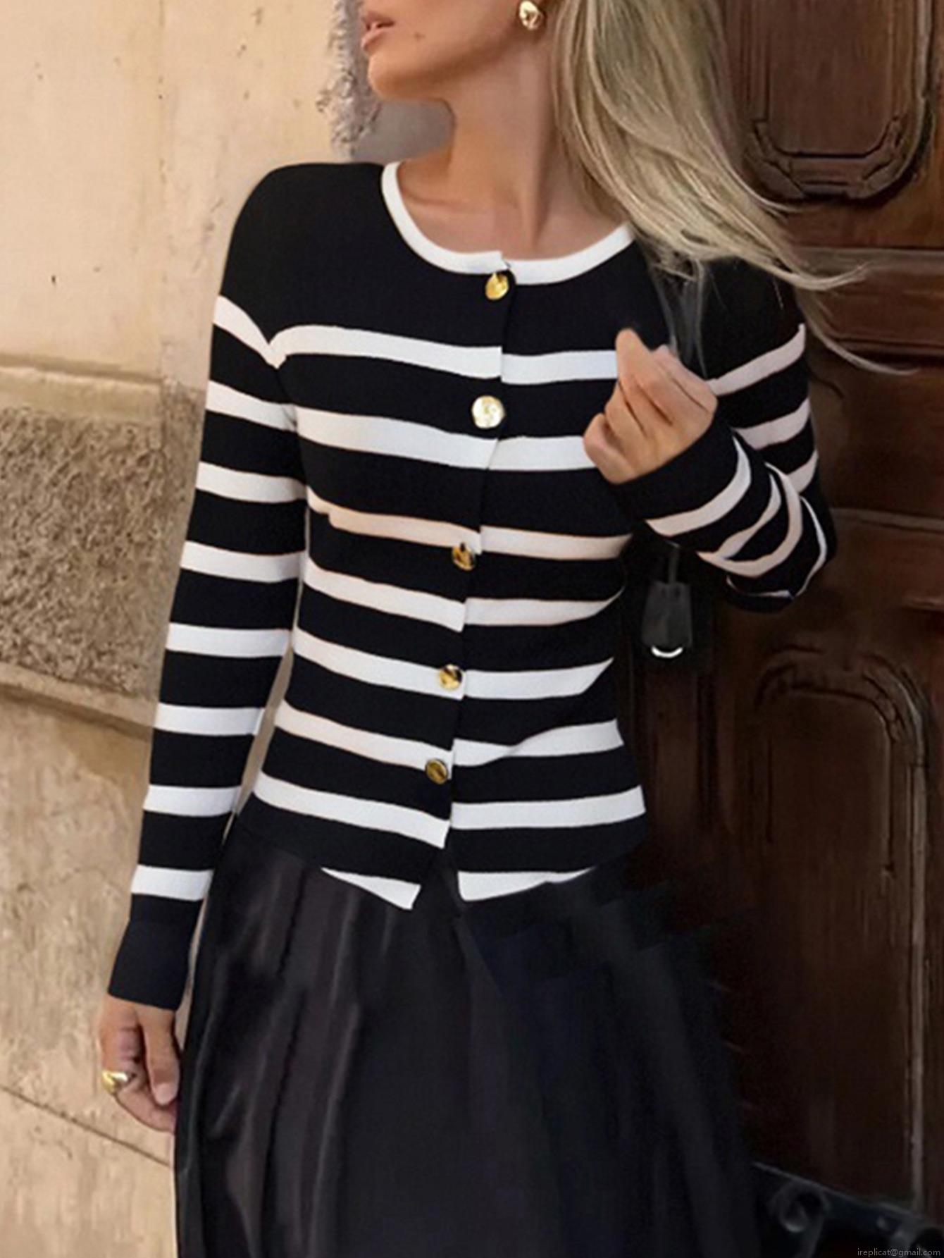 • Women's Elegant Striped Knitted Cardigan With Gold Buttons Viscose Blend Long Sleeve Round Neck Sweater Coat For Office Daily Commute Autumn Winter