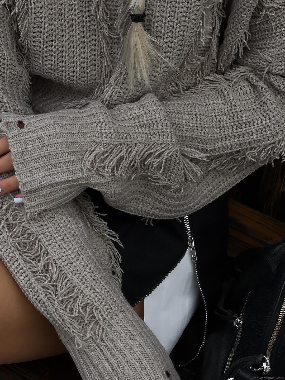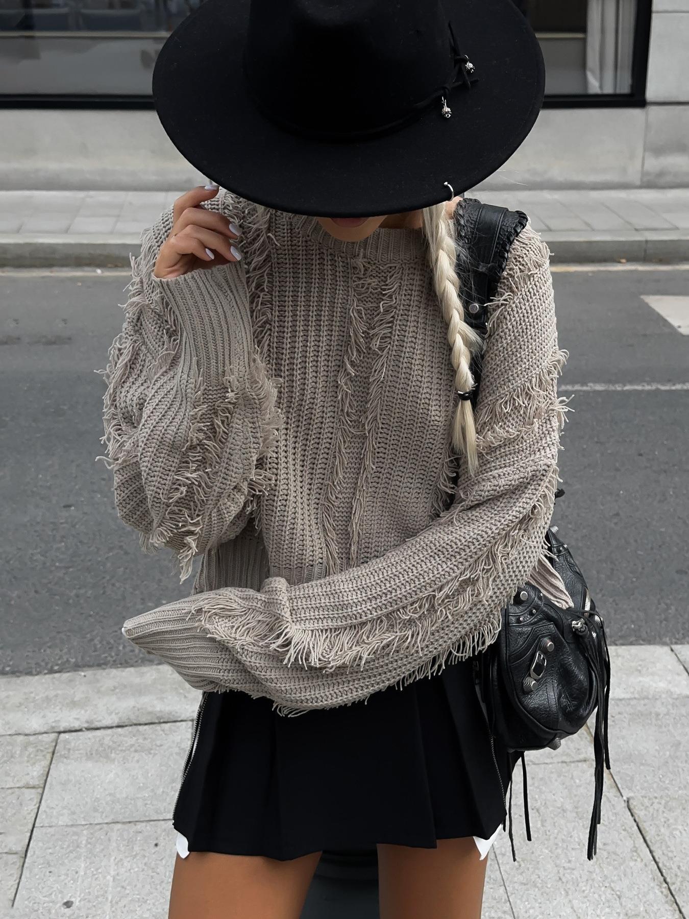 • Women's Fashion Fringe Distressed Knit Sweater Cotton Blend Long Sleeve Round Neck Loose Casual Pullover Streetwear Top