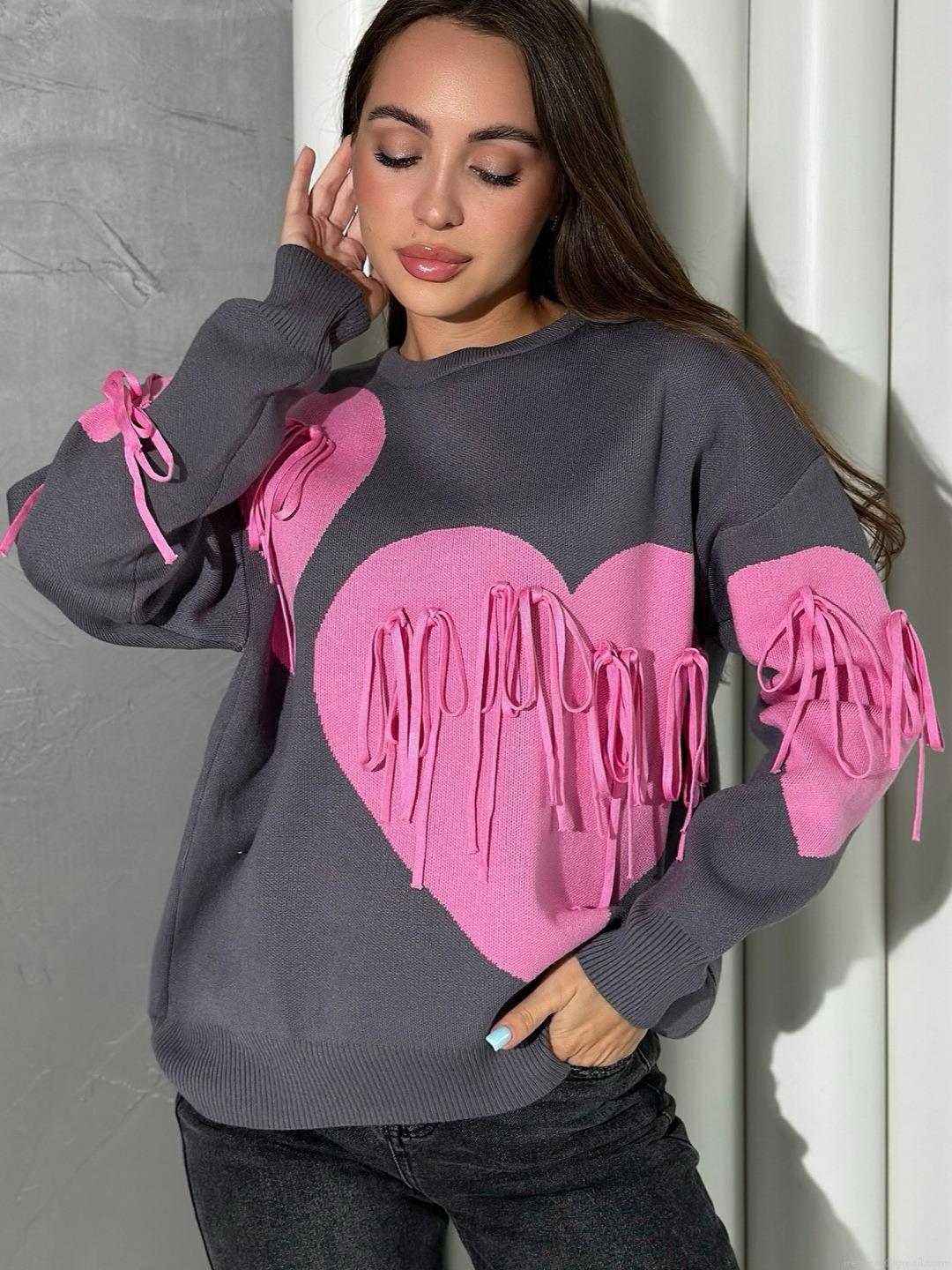 Women's Fashion Heart Pattern Knit Sweater Color Block Long Sleeve Crew Neck Pullover With Tassel Fringed Casual Autumn Winter Slim Fit Knitwear Tops