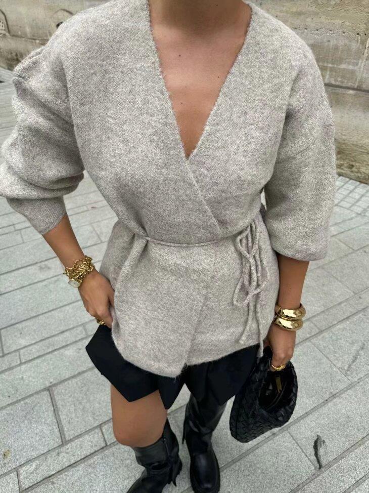• Women's Fashion Solid Color V-Neck Tie-Waist Knit Cardigan Sweater Loose Long Sleeve Casual Knitwear Jacket For Spring Autumn