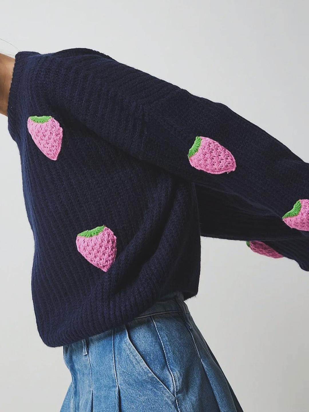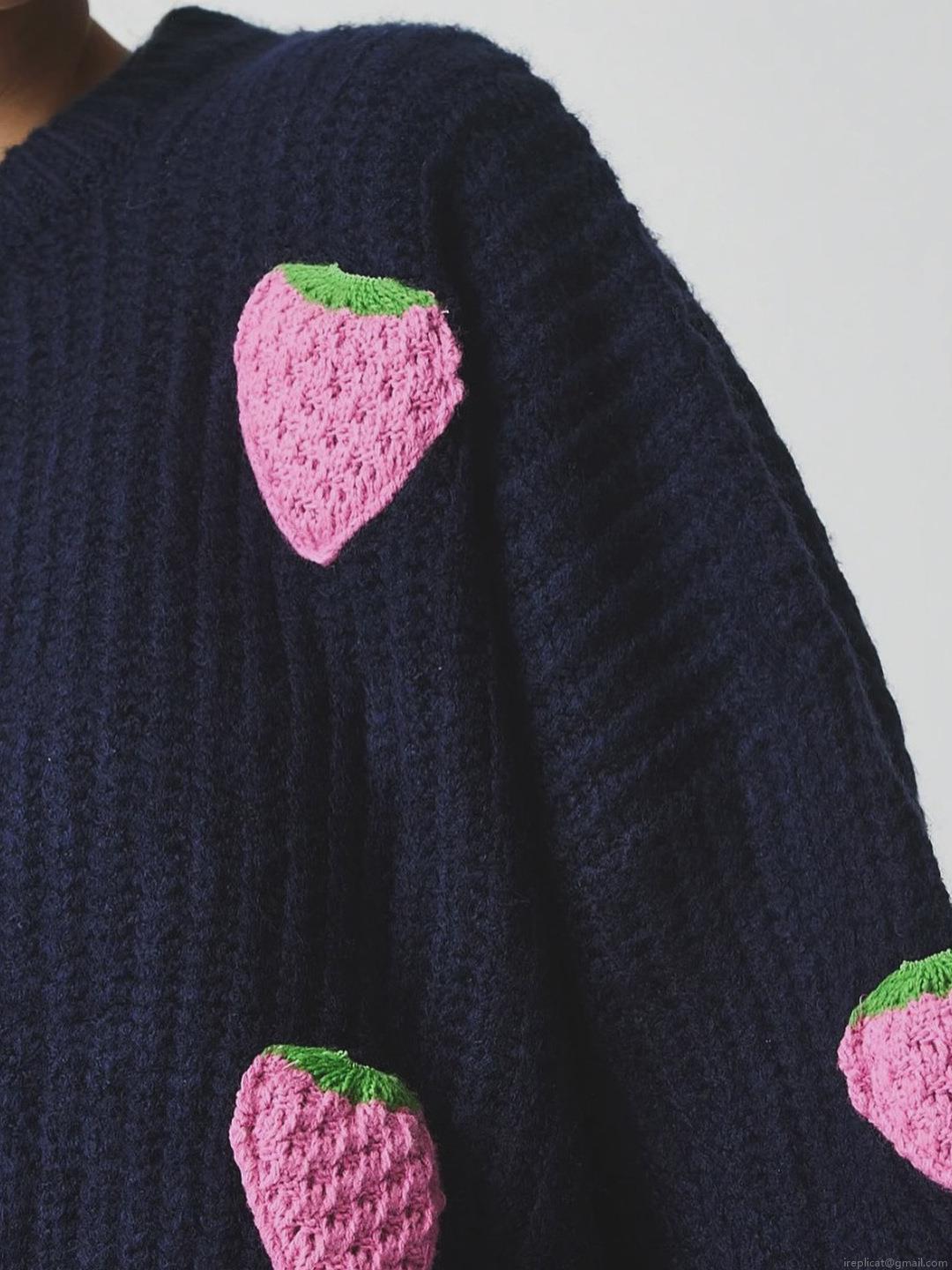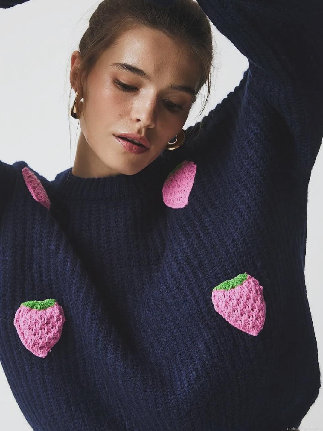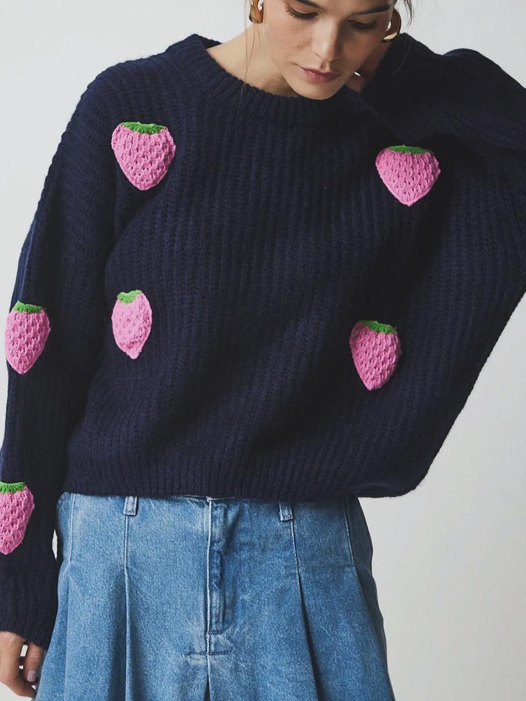 Women's French Style Knitted Sweater Cotton Blend Strawberry Embroidery Pullover Round Neck Long Sleeve Casual Autumn Winter Tops For Women