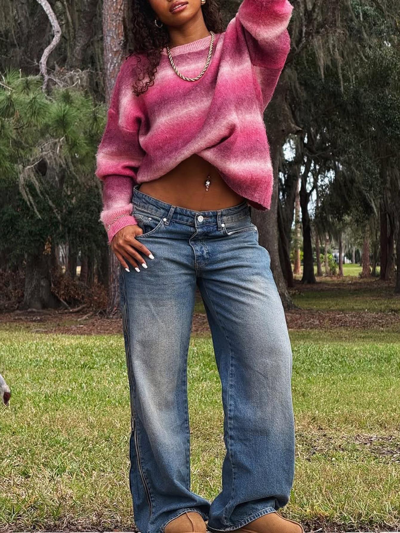 Women's Gradient Pink Purple Crew Neck Long Sleeve Knitted Sweater Casual Loose Fit Soft Pullover Top For Autumn Winter