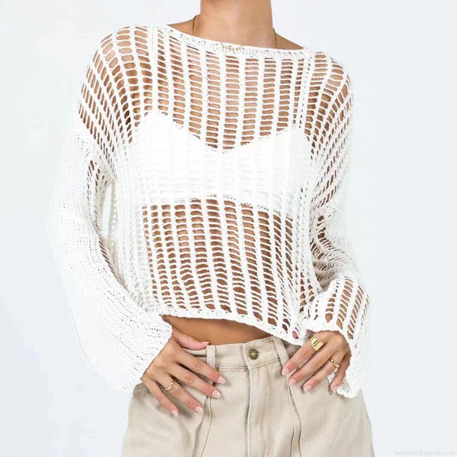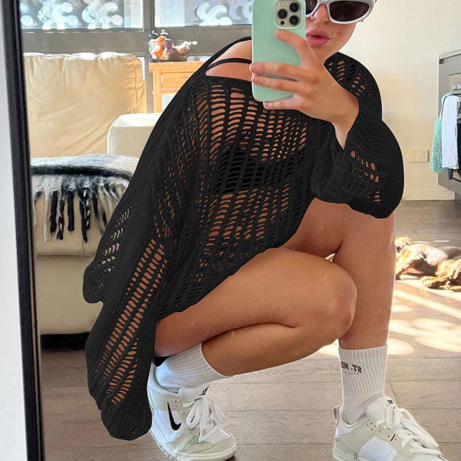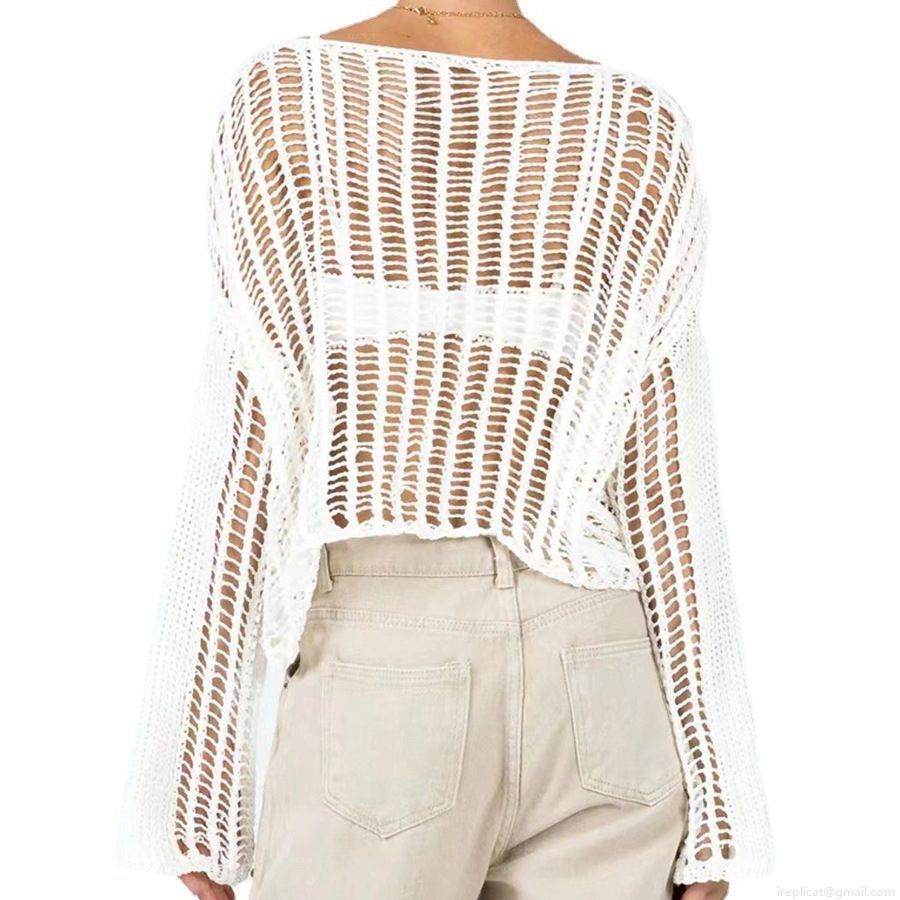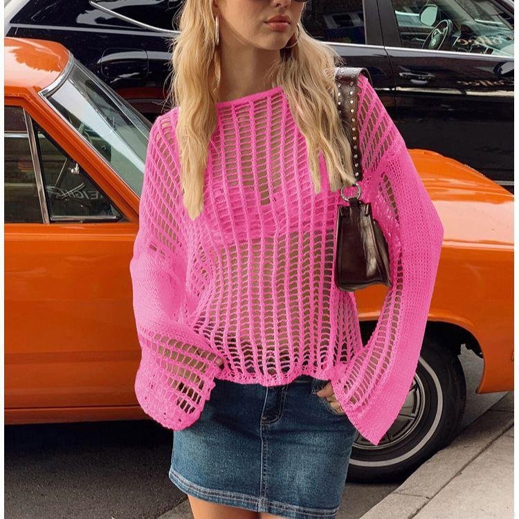 • Women's Hollow Out Crochet Knit Top Long Sleeve Bell Sleeve Sheer Polyester Sun Protection Cover Up Cropped Sweater For Beach Vacation Y2K Streetwear