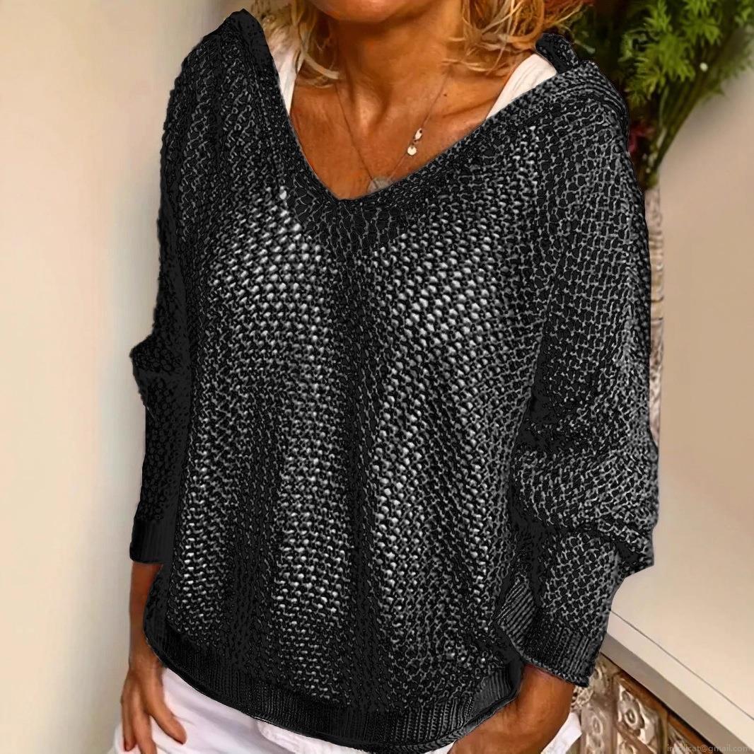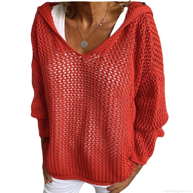 • Women's Hollow Out Hooded Knit Sweater Loose V-Neck Long Sleeve Crochet Sun Protection Pullover Top Casual Summer Beach Breathable Knitwear