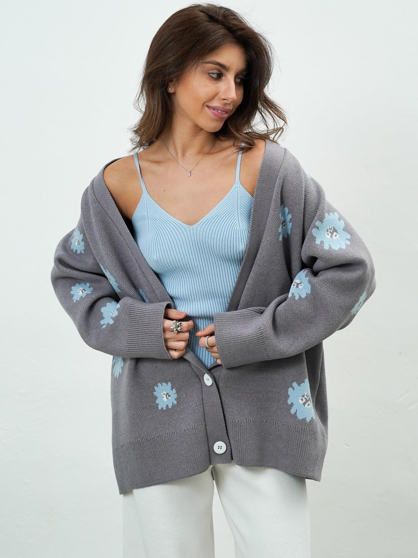 Women's Knit Cardigan Sweater Daisy Embroidery Cotton Polyester Blend Loose Fit Warm Button Down Lazy Style Knitwear For Autumn Winter Casual Outerwear Ladies Top