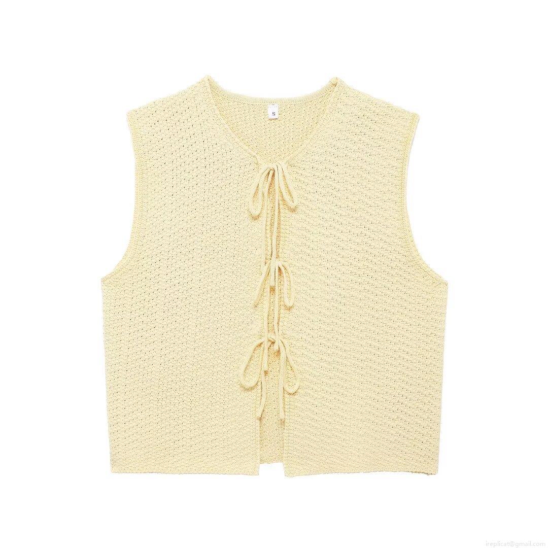 Women's Knitted Vest Retro V Neck Sleeveless Bow Tie Front Loose Fit Waistcoat Cardigan Casual Streetwear Polyester Knit Top For Women