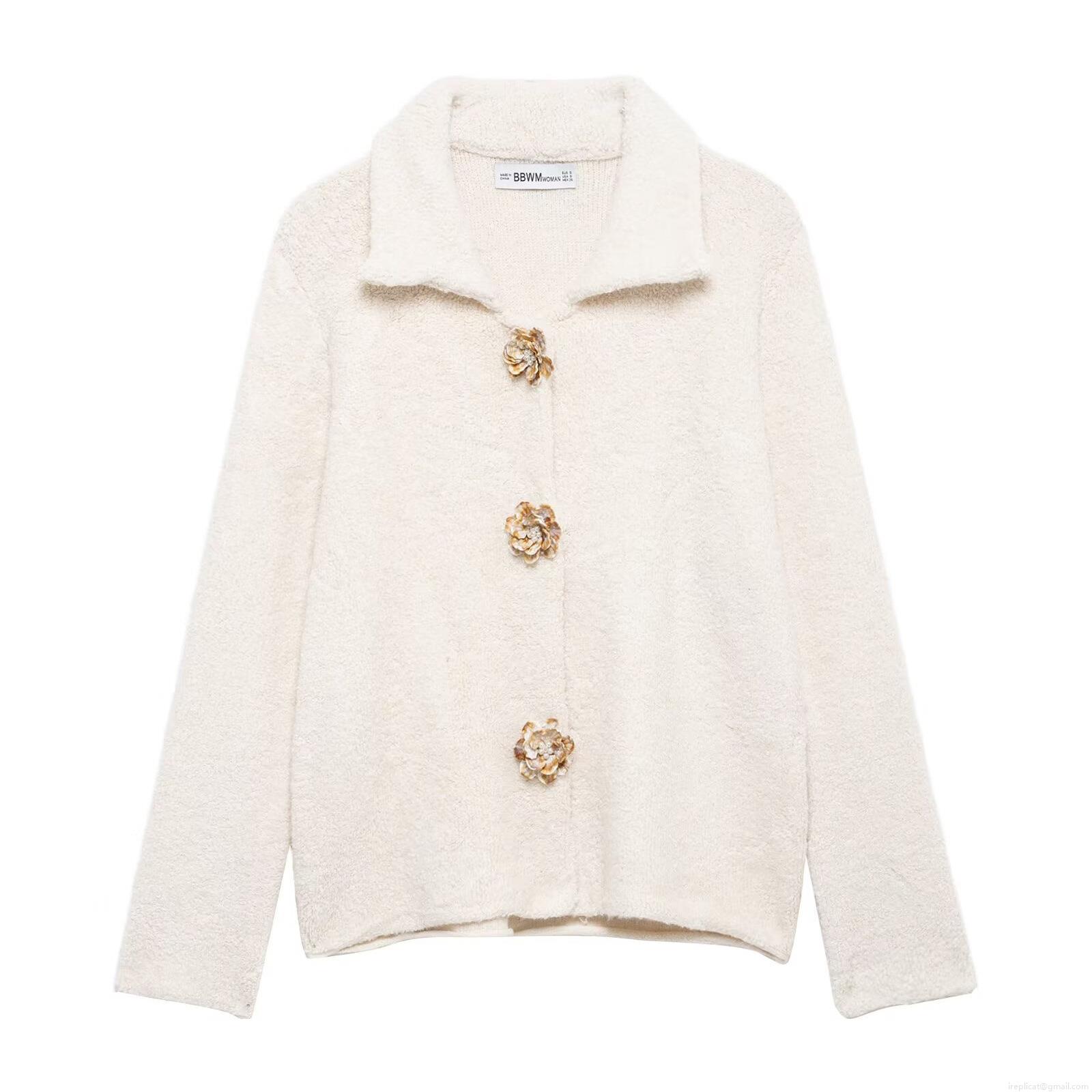 Women's Lapel Long Sleeve Knit Cardigan Jacket Vintage Metal Flower Button Fuzzy Sweater Outerwear Casual Autumn Winter Tops