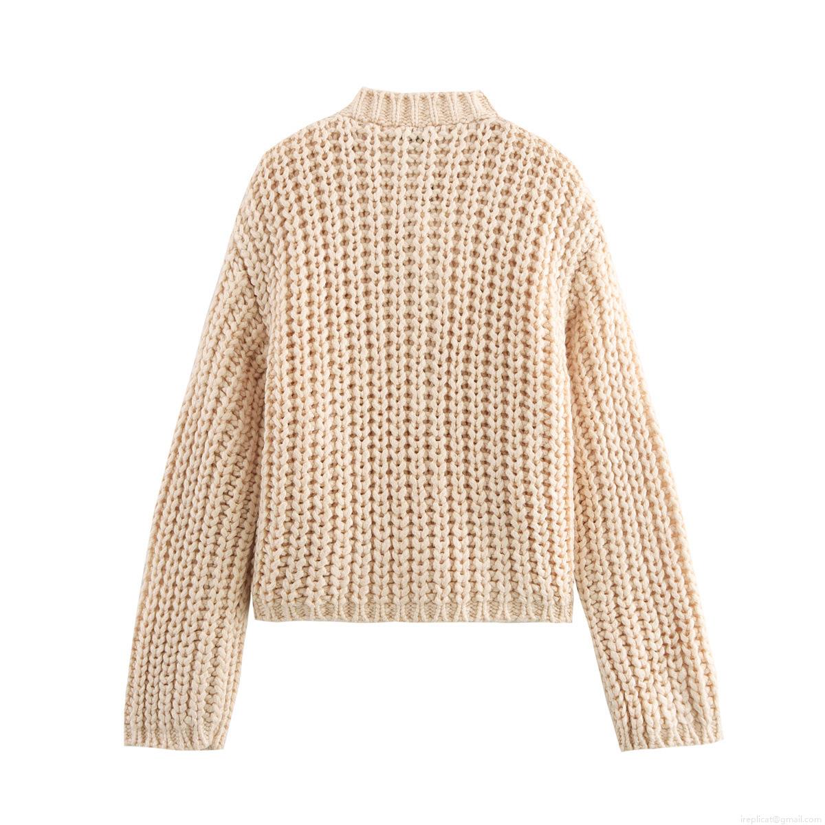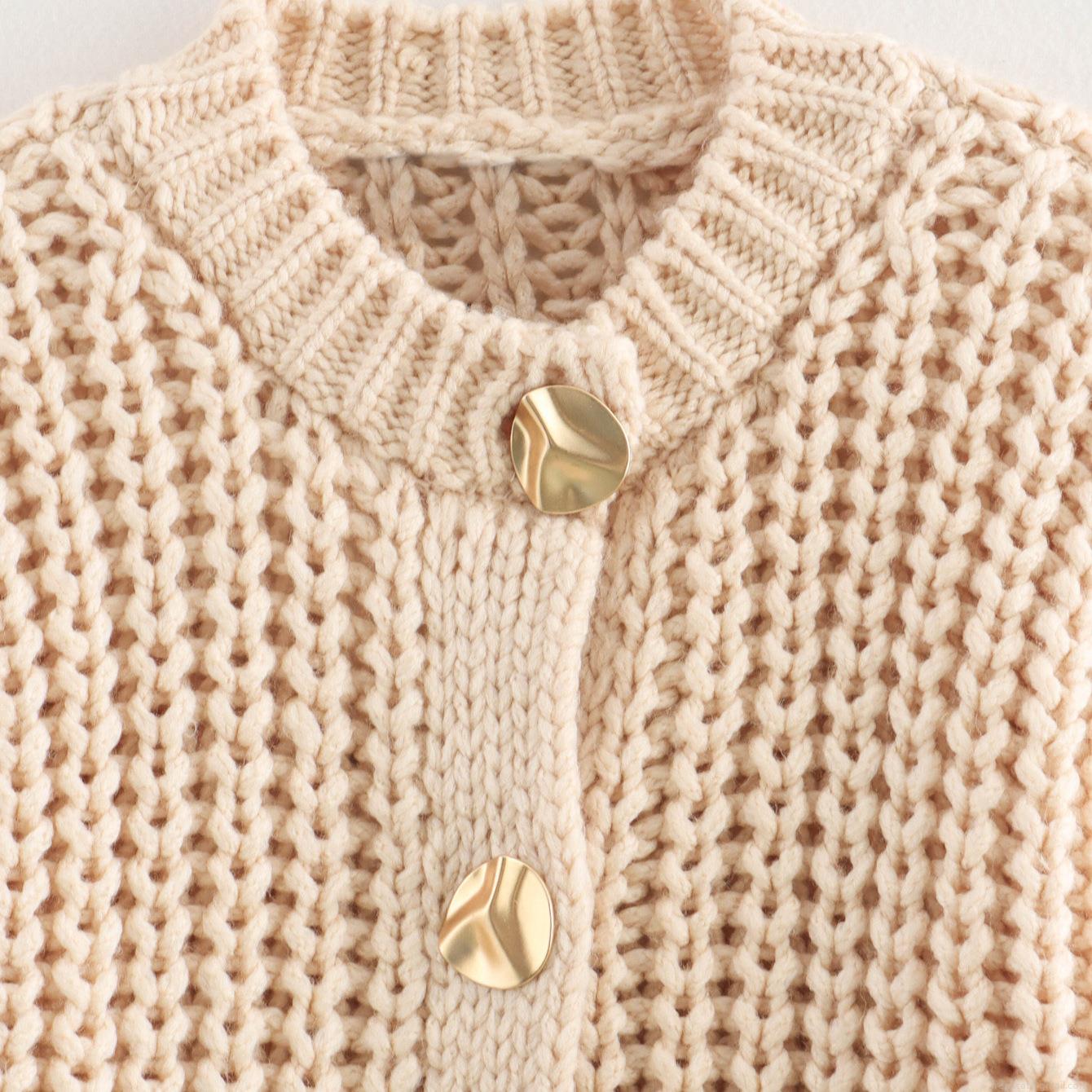 • Women's Lazy Style Round Neck Coarse Knit Sweater Cardigan With Gold Buttons And Pockets Loose Short Knitwear For Autumn Winter