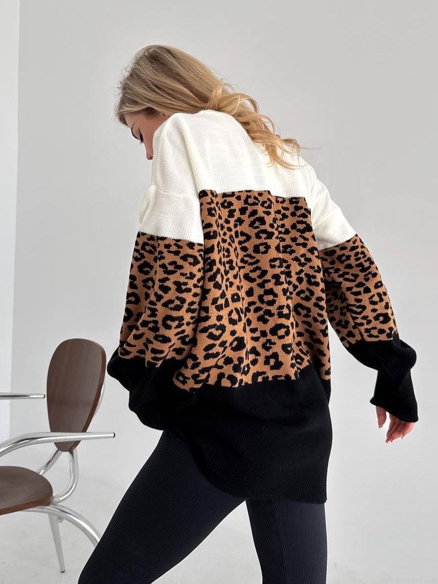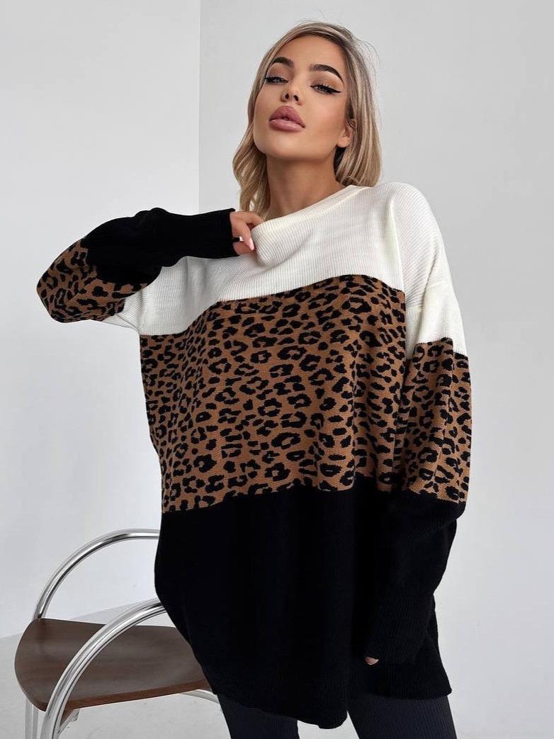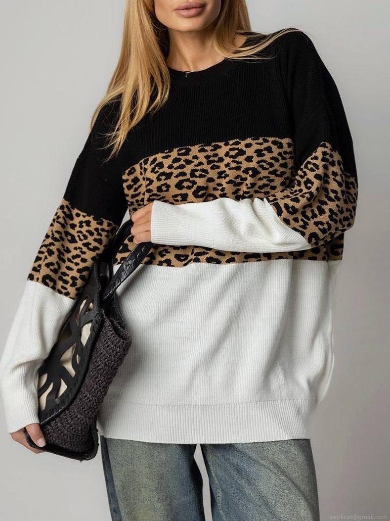 • Women's Leopard Print Patchwork Knitted Sweater Crew Neck Color Block Pullover Loose Long Sleeve Autumn Winter Casual Knitwear Top