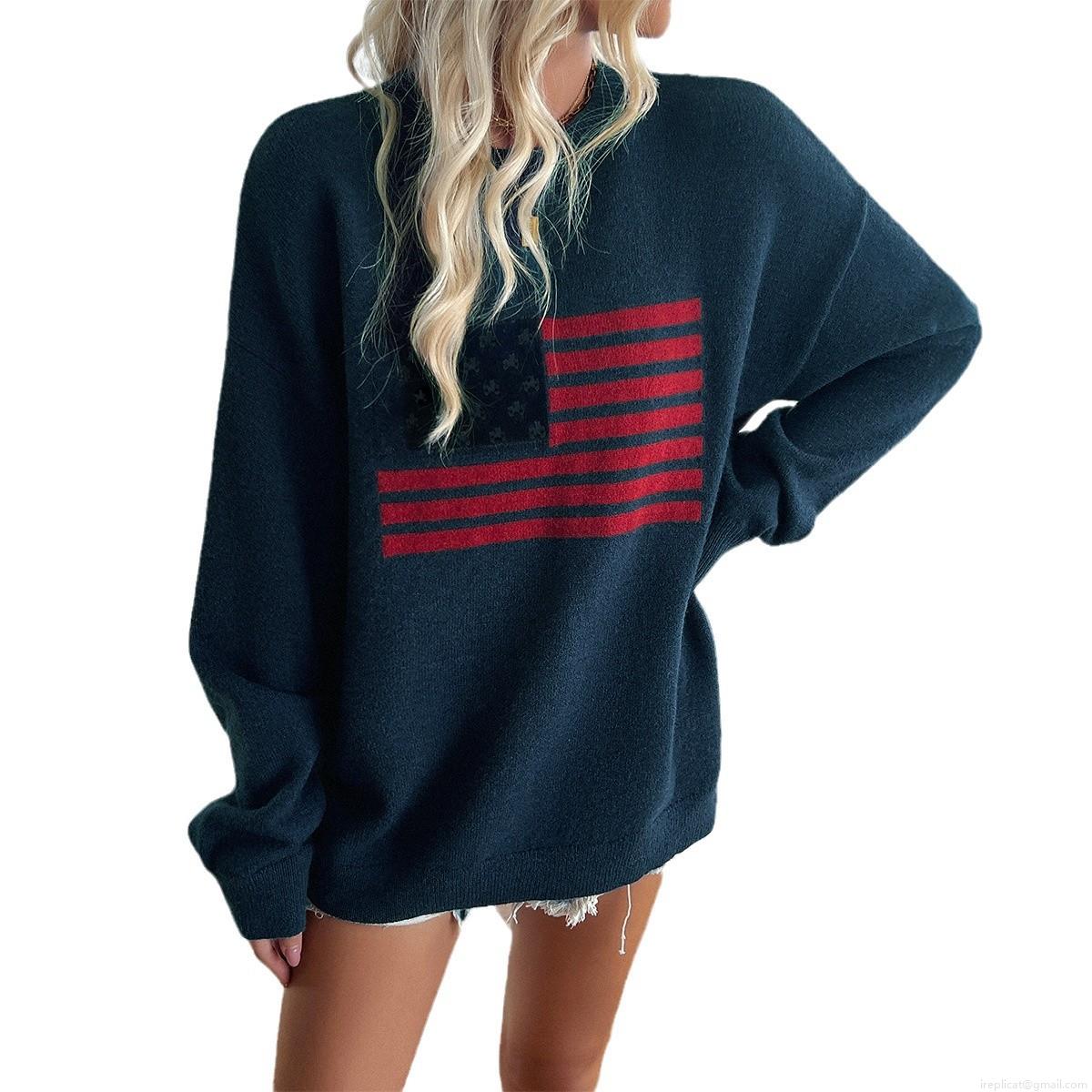 • Women's Loose American Flag Knit Sweater Independence Day Oversized Round Neck Long Sleeve Pullover Autumn Winter Casual Knitwear Top
