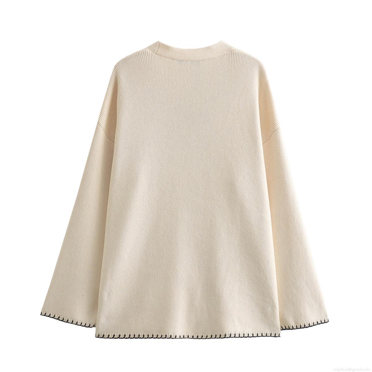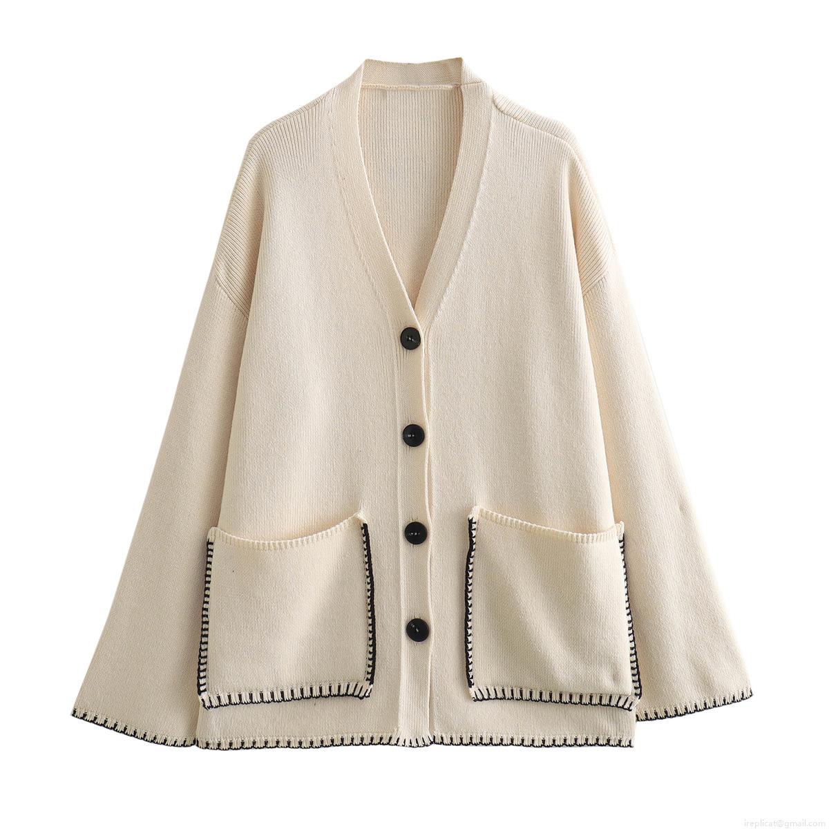 • Women's Loose Knit Cardigan Sweater Contrast Trim Deep V-Neck Single Breasted Long Sleeve Top With Pockets Casual Streetwear Cream Polyester Knitwear