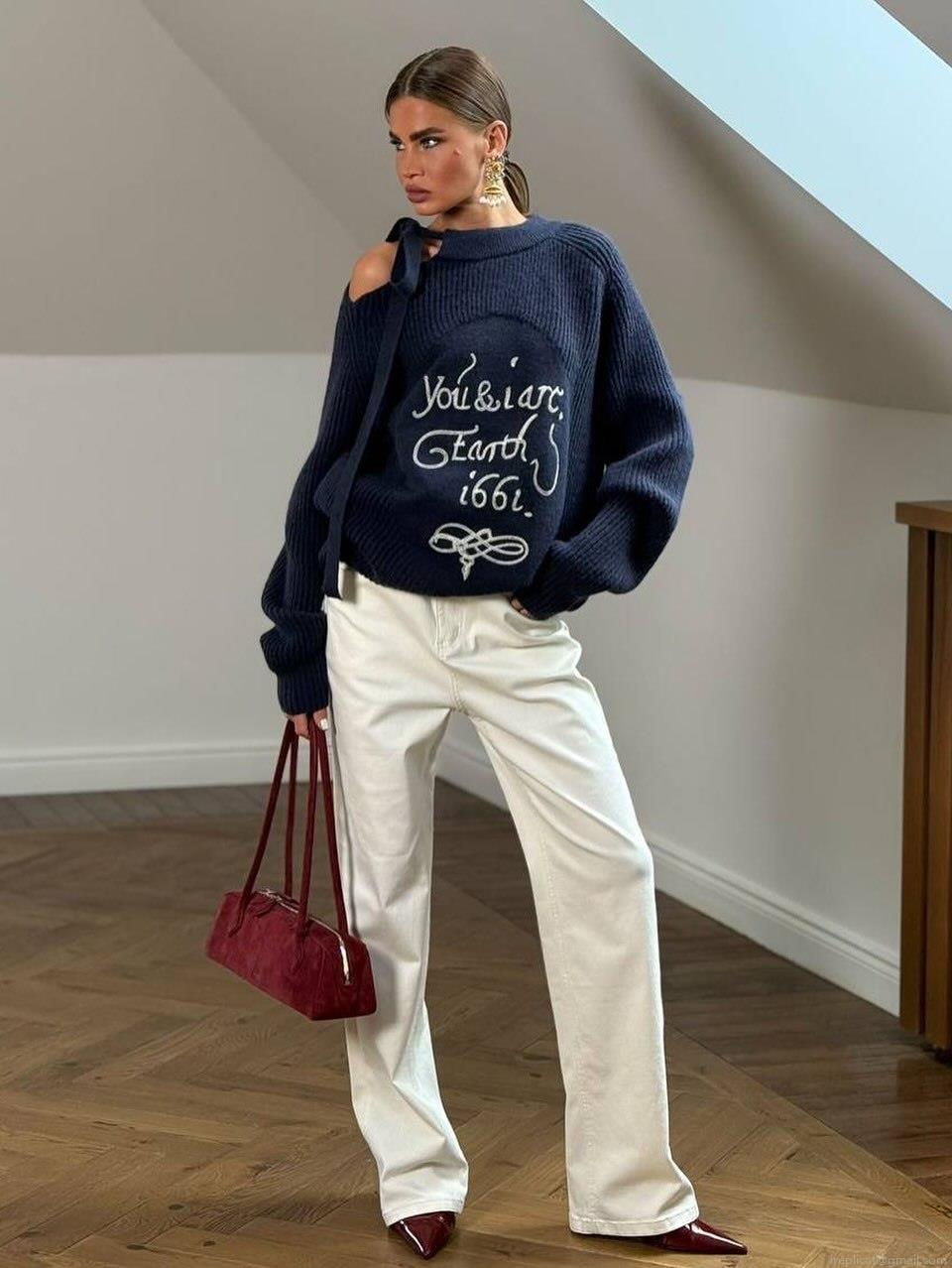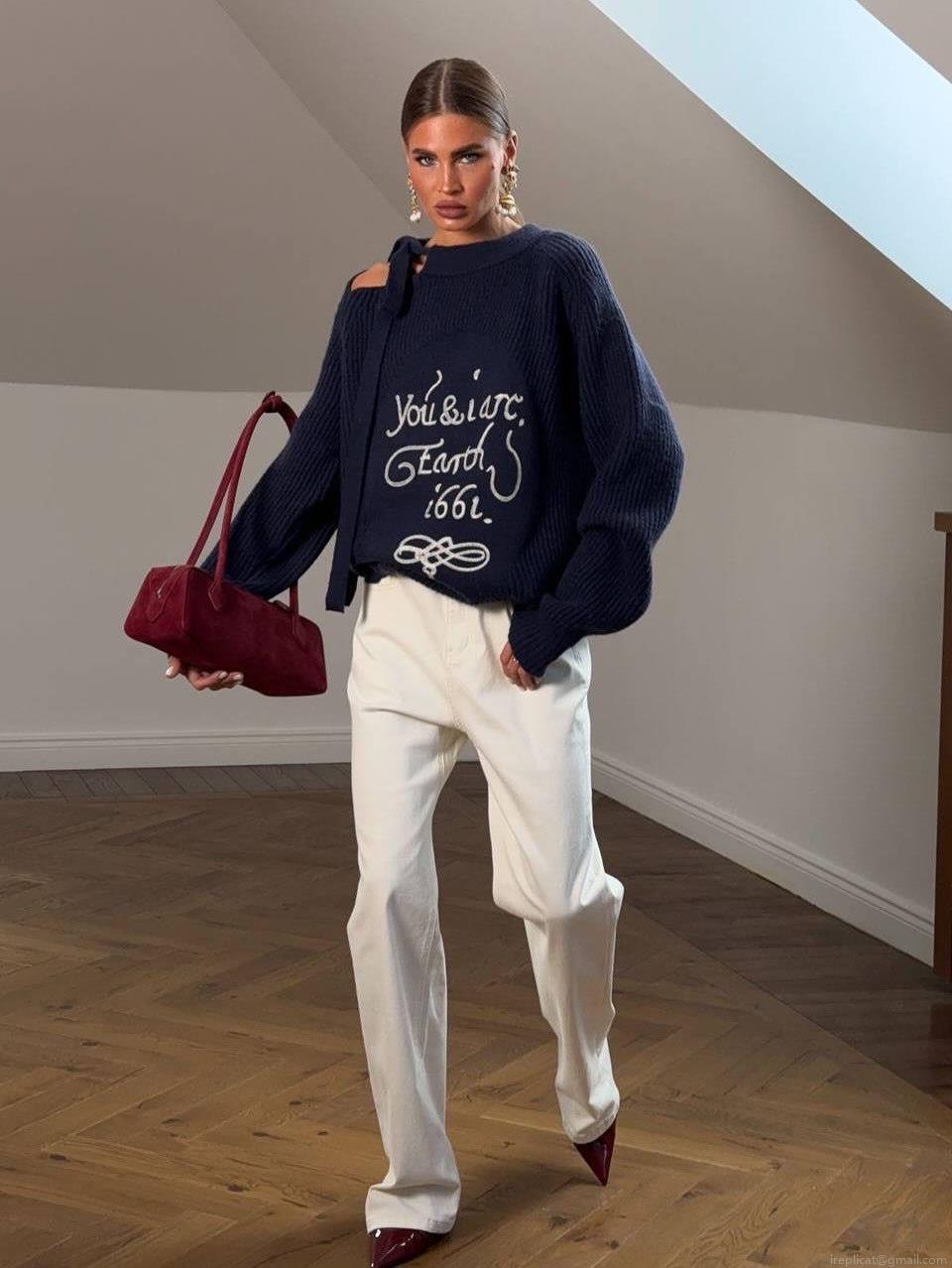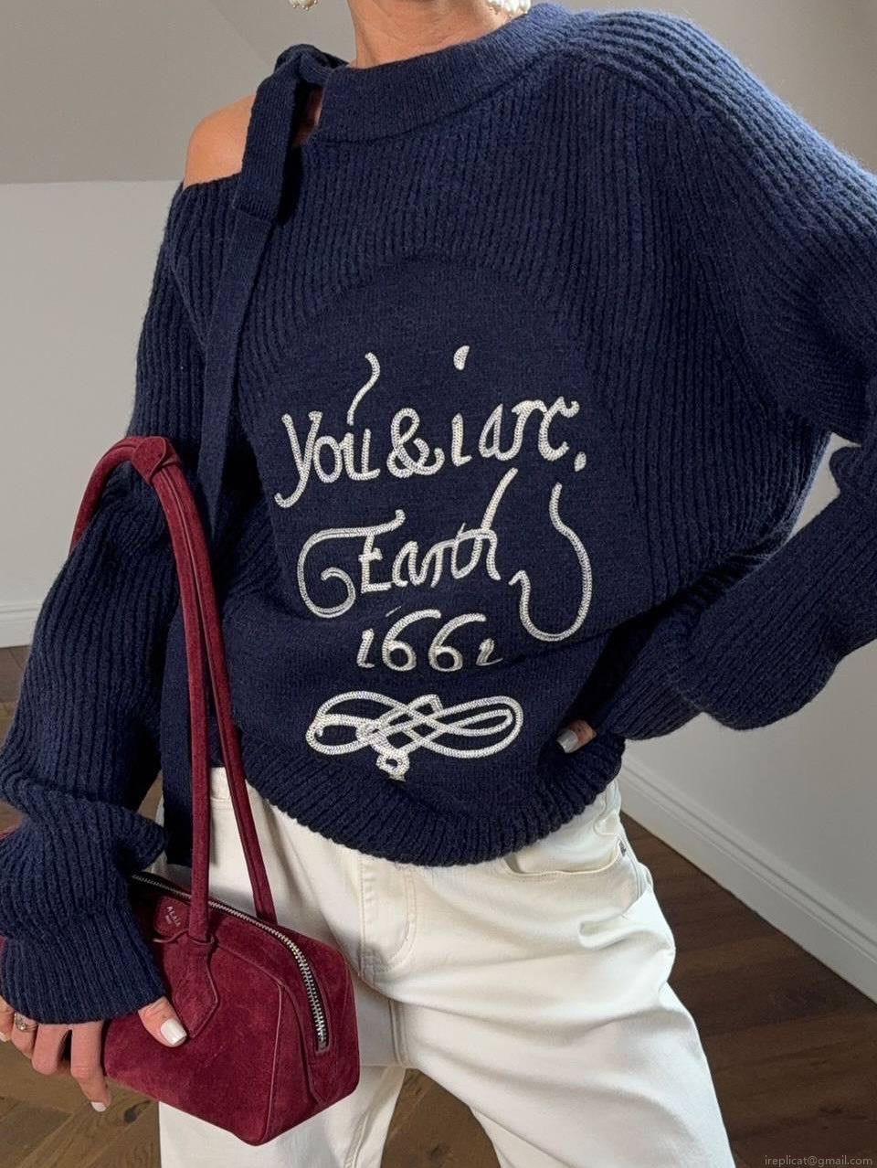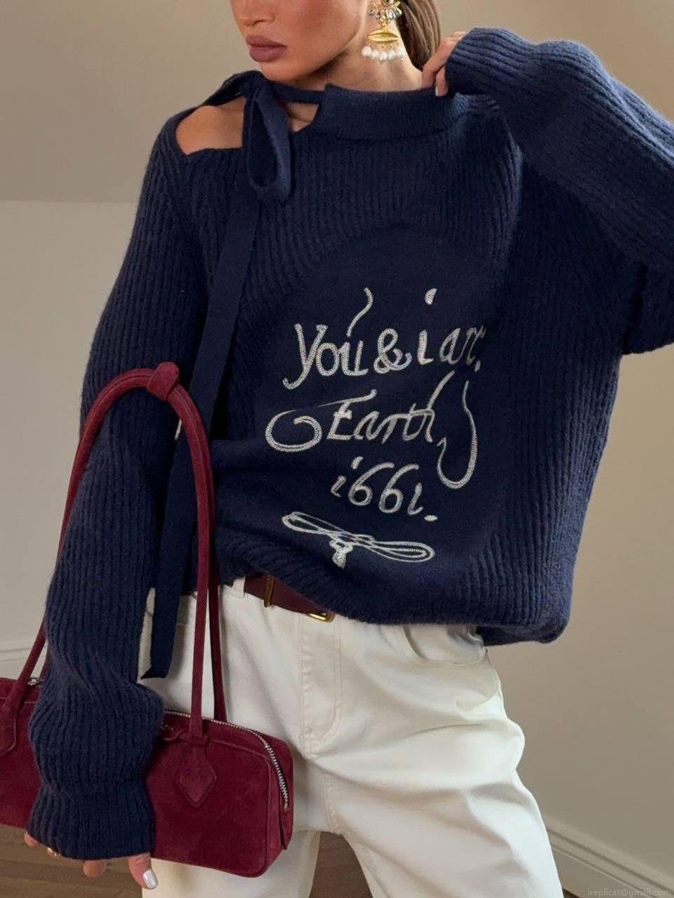 • Women's Loose Knitted Sweater Cotton Blend Letter Embroidery Off Shoulder Bow Tie Pullover Casual Long Sleeve Knitwear Top