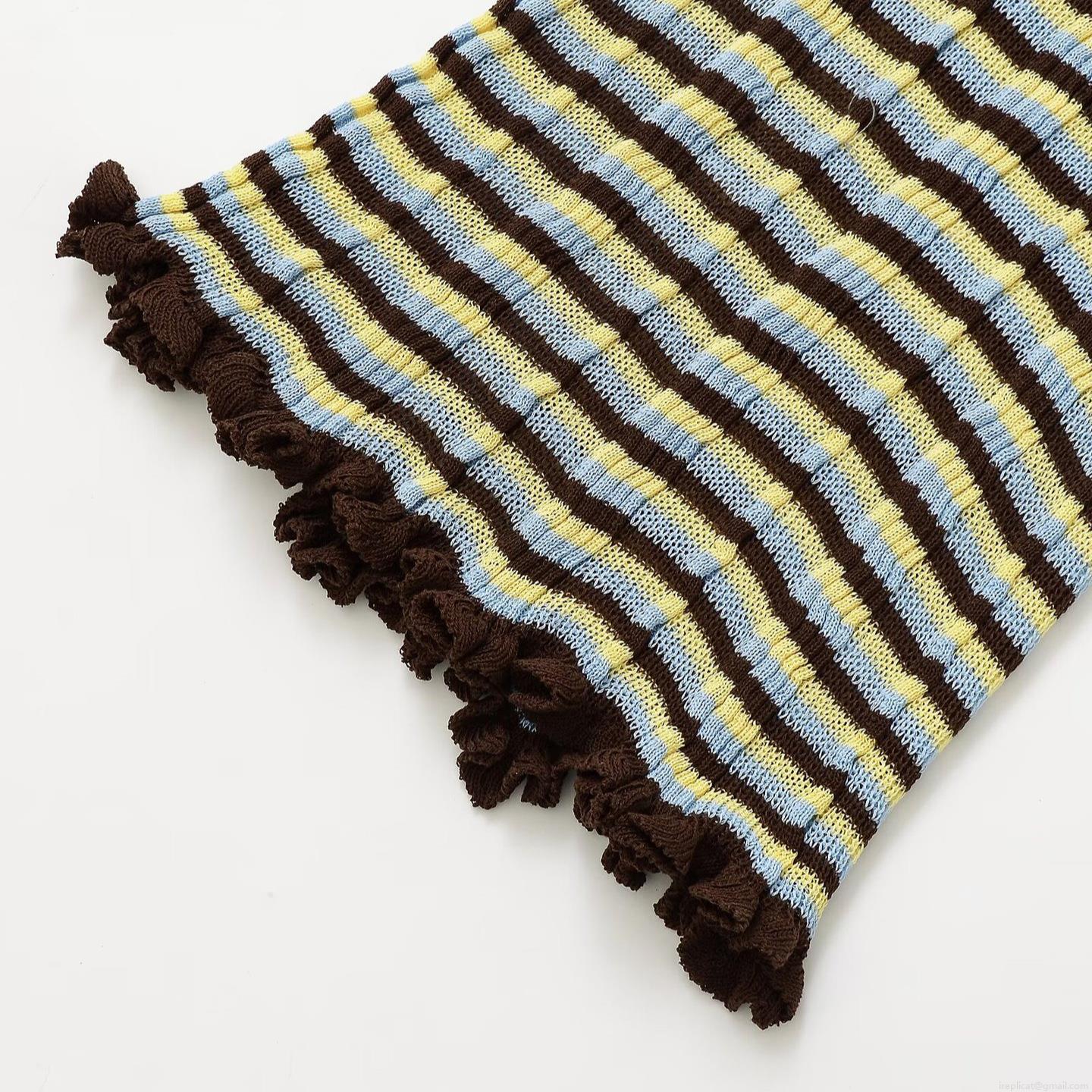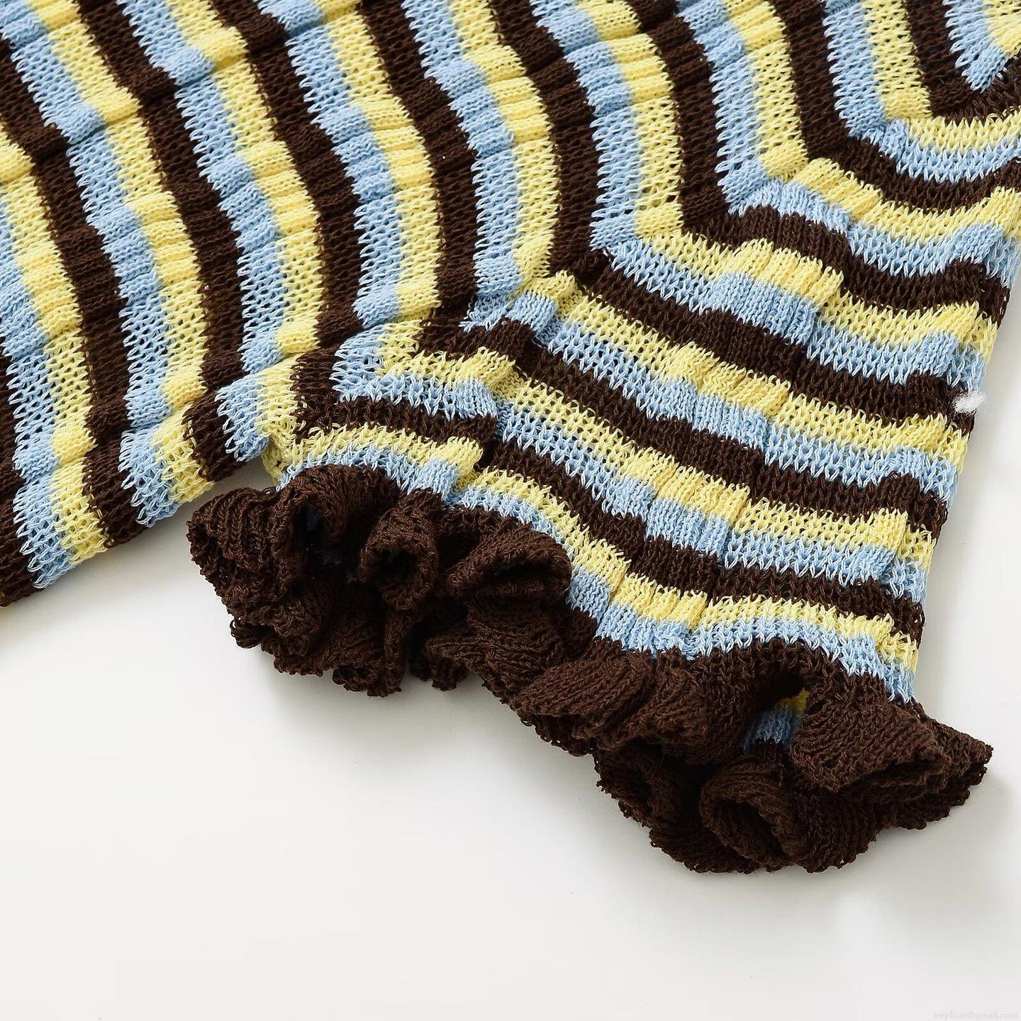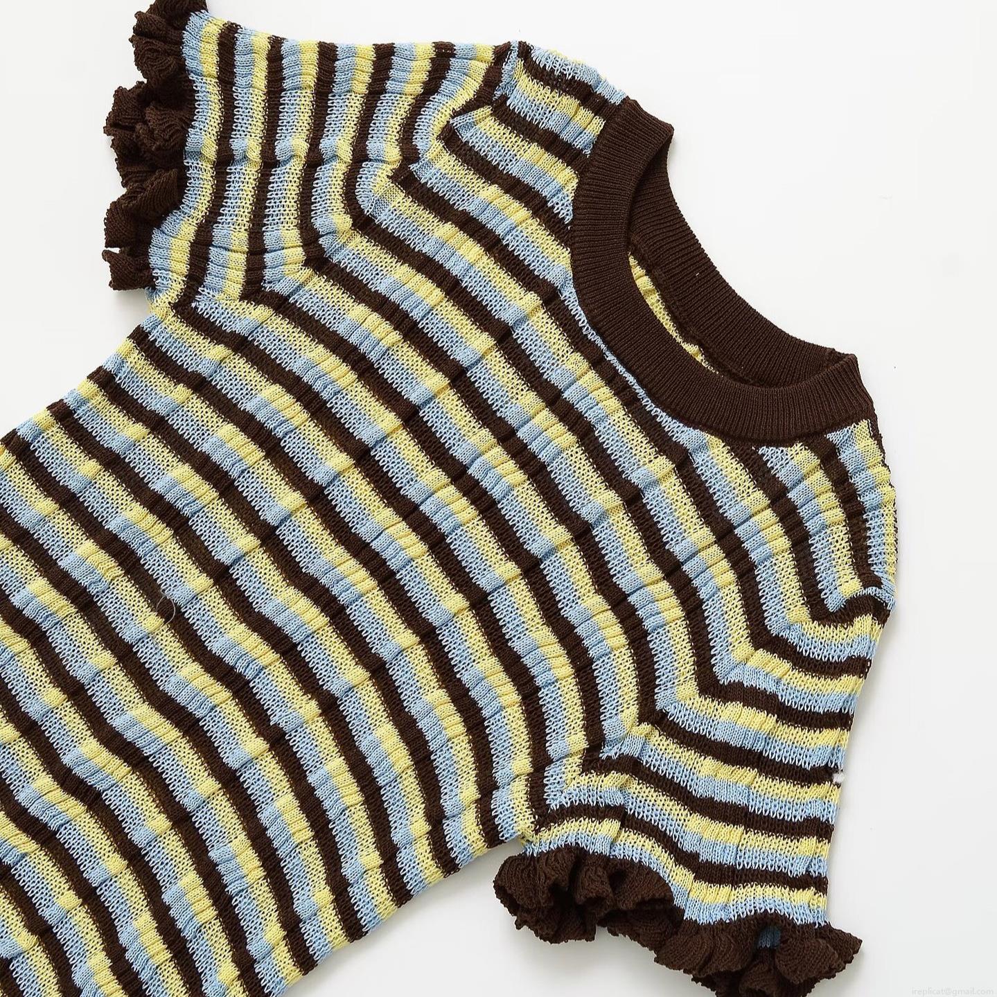 Women's Mercerized Cotton Knitted Striped T-Shirt Round Neck Ruffle Hem Slim Fit Short Sleeve Summer Casual Top