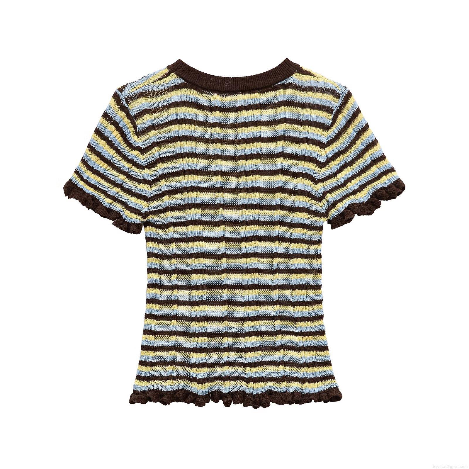 • Women's Mercerized Cotton Knitted Striped T-Shirt Round Neck Ruffle Hem Slim Fit Short Sleeve Summer Casual Top